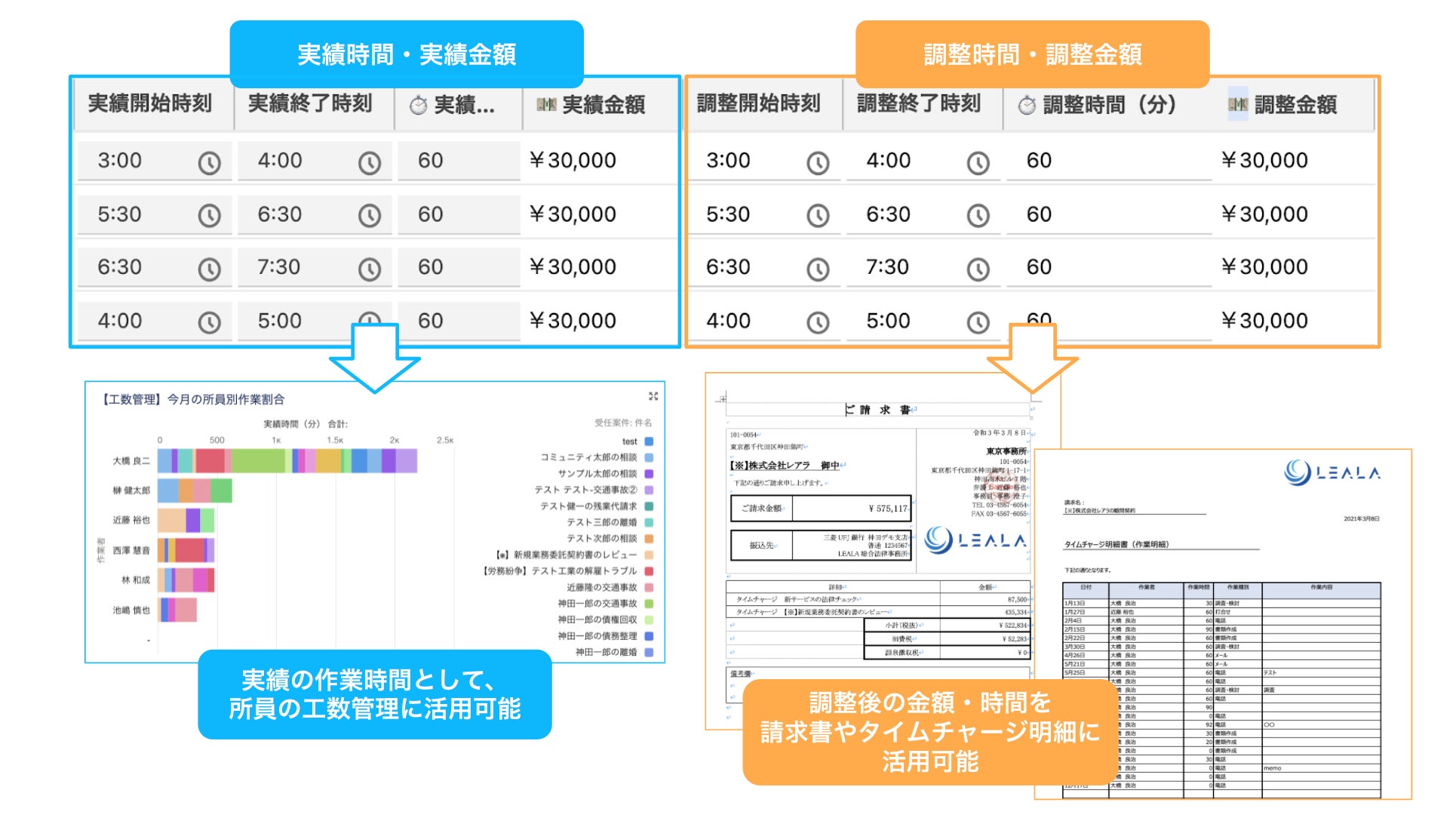 取引先へ送付する請求書やタイムチャージには調整後の金額を記載する一方で、実績時間・金額をベースに所員の実工数管理に活用することも可能となります。