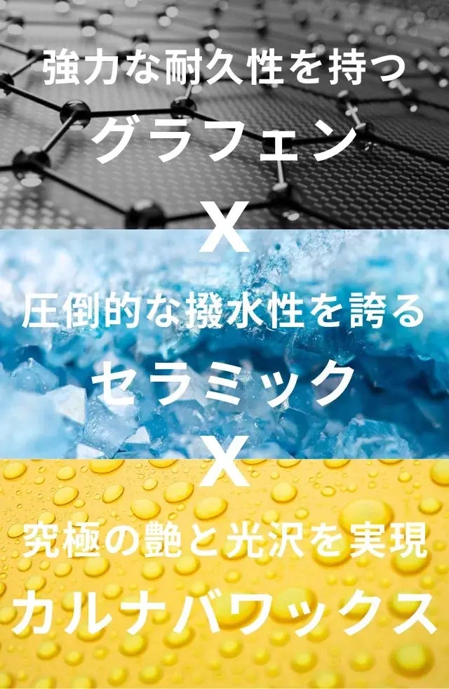 カルナバワックスの光沢が加わり、コーティングされた表面が美しく輝きます。同時に、グラフェンとセラミックが表面を保護し、外部からのダメージや汚れから守ります。