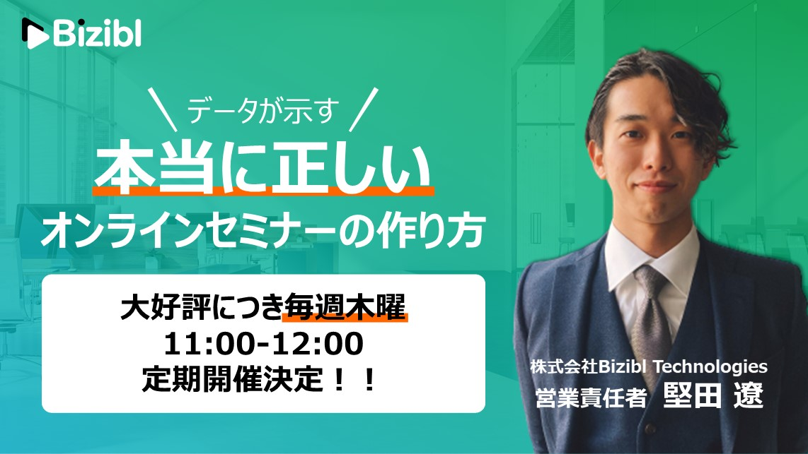 株式会社Bizibl Technologies(本社:大阪市北区、代表取締役:花谷燿平、以下当社)は、開発・提供するオンラインセミナー開催SaaS『Bizibl(ビジブル)』において、マーケター向けに「データが示す 本当に正しいオンラインセミナーの作り方」と題したセミナーを、2022年4月より毎週木曜日に定期開催いたします。