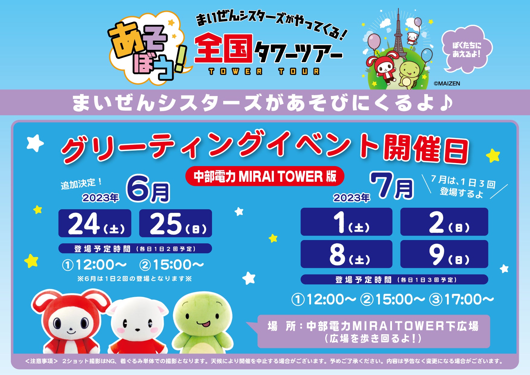 トラストトウキョウ株式会社(本社:東京都渋谷区)は中部電力MIRAI TOWERとまいぜんシスターズがコラボする『あそぼう!まいぜんシスターズがやってくる!〜全国タワーツアー』in 中部電力MIRAI TOWERを開催いたします。
