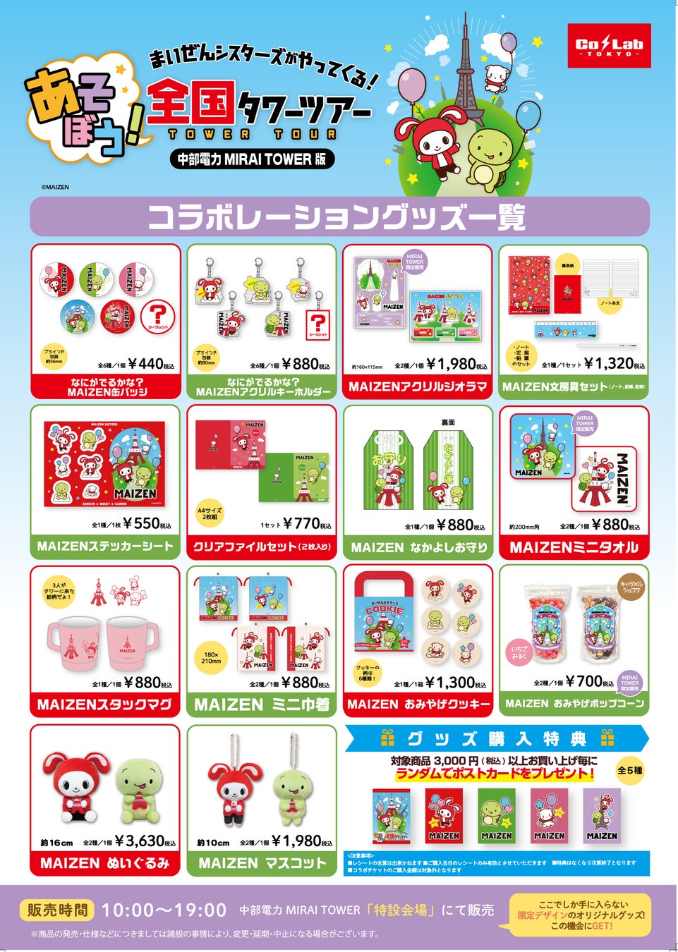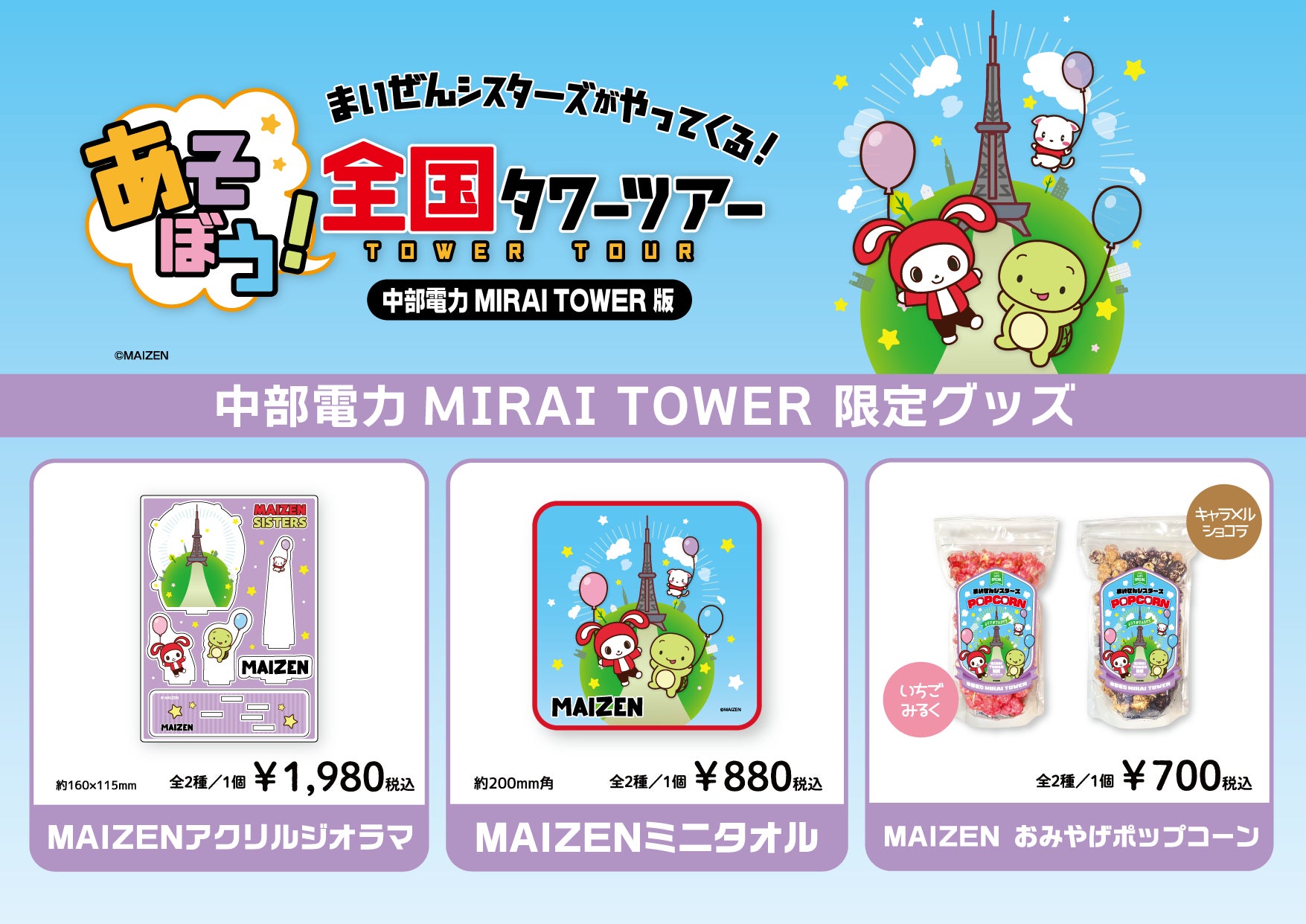 中部電力MIRAI TOWER3階「まいぜんシスターズ特設会場」では、「あそぼう!まいぜんシスターズがやってくる!〜全国タワーツアー」の為に描き下ろしたイラストを使用した限定グッズを販売いたします。