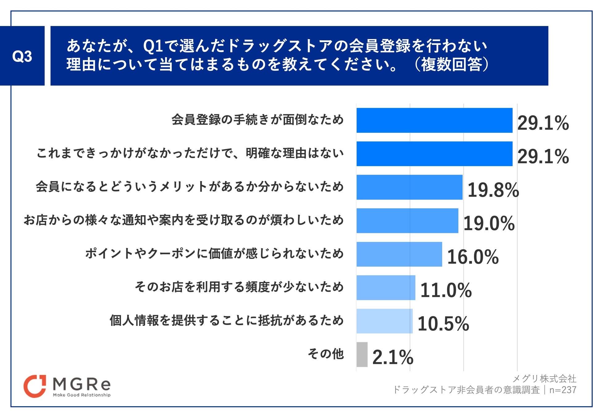 「Q3.あなたが、一番利用するドラッグストアの会員登録を行わない理由について当てはまるものを教えてください。(複数回答)」(n=237)と質問したところ、「会員登録の手続きが面倒なため」が29.1%、「これまできっかけがなかっただけで、明確な理由はない」が29.1%、「会員になるとどういうメリットがあるか分からないため」が19.8%という回答となりました。