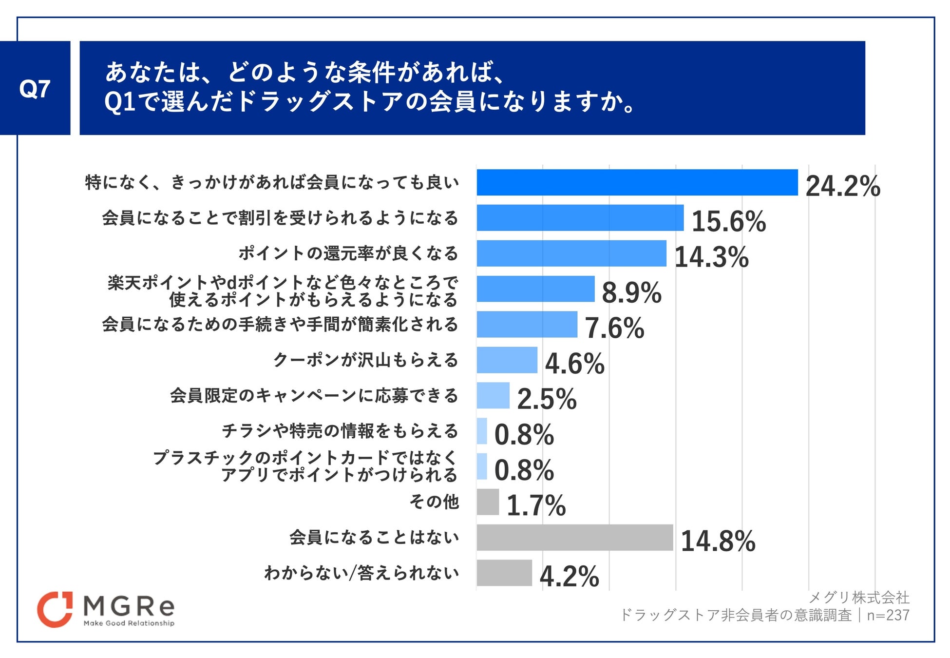 「Q7.あなたは、どのような条件があれば、一番利用するドラッグストアの会員になりますか。」(n=237)と質問したところ、「特になく、きっかけがあれば会員になっても良い」が24.2%、「会員になることで割引を受けられるようになる」が15.6%、「ポイントの還元率が良くなる」が14.3%という回答となりました。