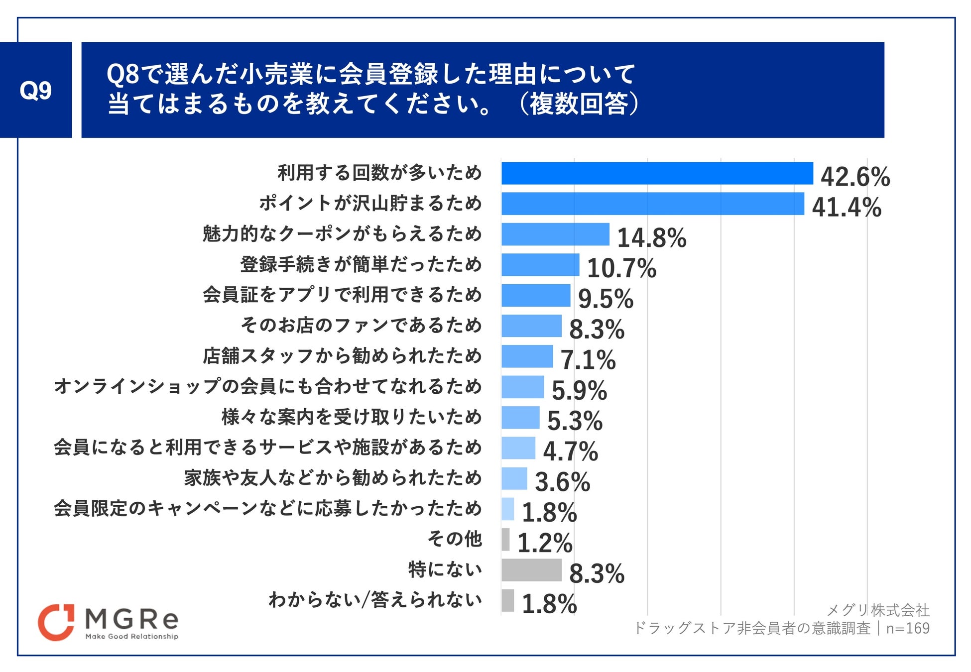 Q8で「小売業の会員登録は一切していない」「わからない/答えられない」以外を回答した方に、「Q9.Q8で選んだ小売業に会員登録した理由について当てはまるものを教えてください。(複数回答)」(n=169)と質問したところ、「利用する回数が多いため」が42.6%、「ポイントが沢山貯まるため」が41.4%、「魅力的なクーポンがもらえるため」が14.8%という回答となりました。