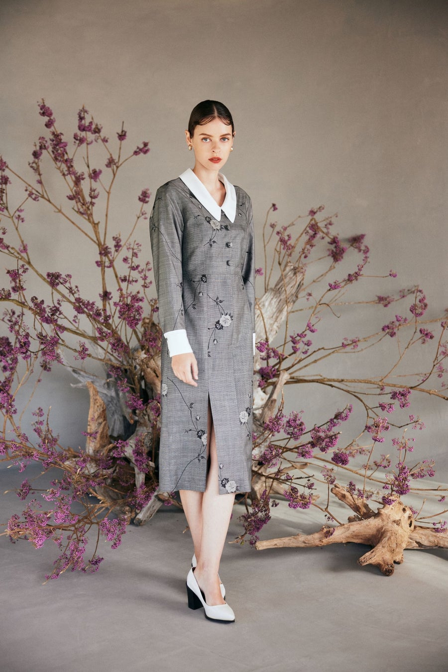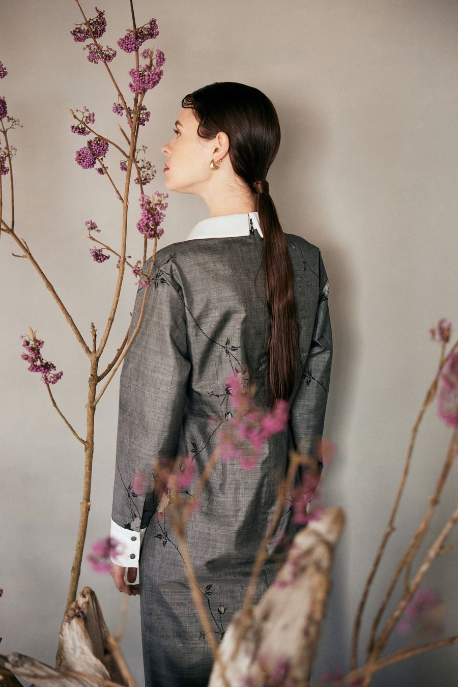 襟と袖口の配色がメリハリと爽やかさをプラスし、胸元と袖口にはくるみボタンをあしらった気品あふれるデザインです。