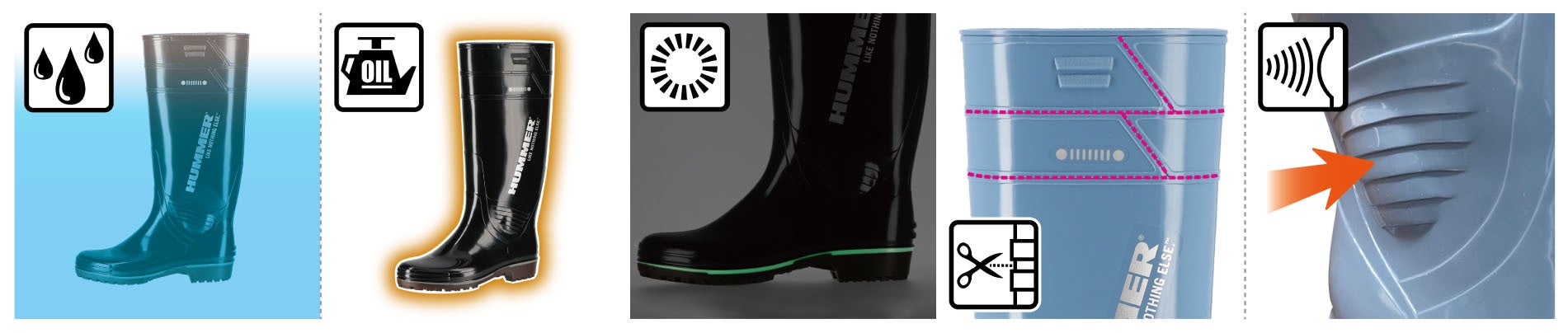 宮城県仙台の地からプロに愛されるレインウェアやワークウェアを発信している弘進ゴムは、「HUMMER」の日本製PVCブーツを新たにリリース。「HUMMER」ブランドは、どんな天候、悪路でも走破できるような強靭で機動的なイメージや、ブランドメッセージである「LIKE NOTHING ELES(唯一無二)」を表現、付加価値とした商品を展開しております。