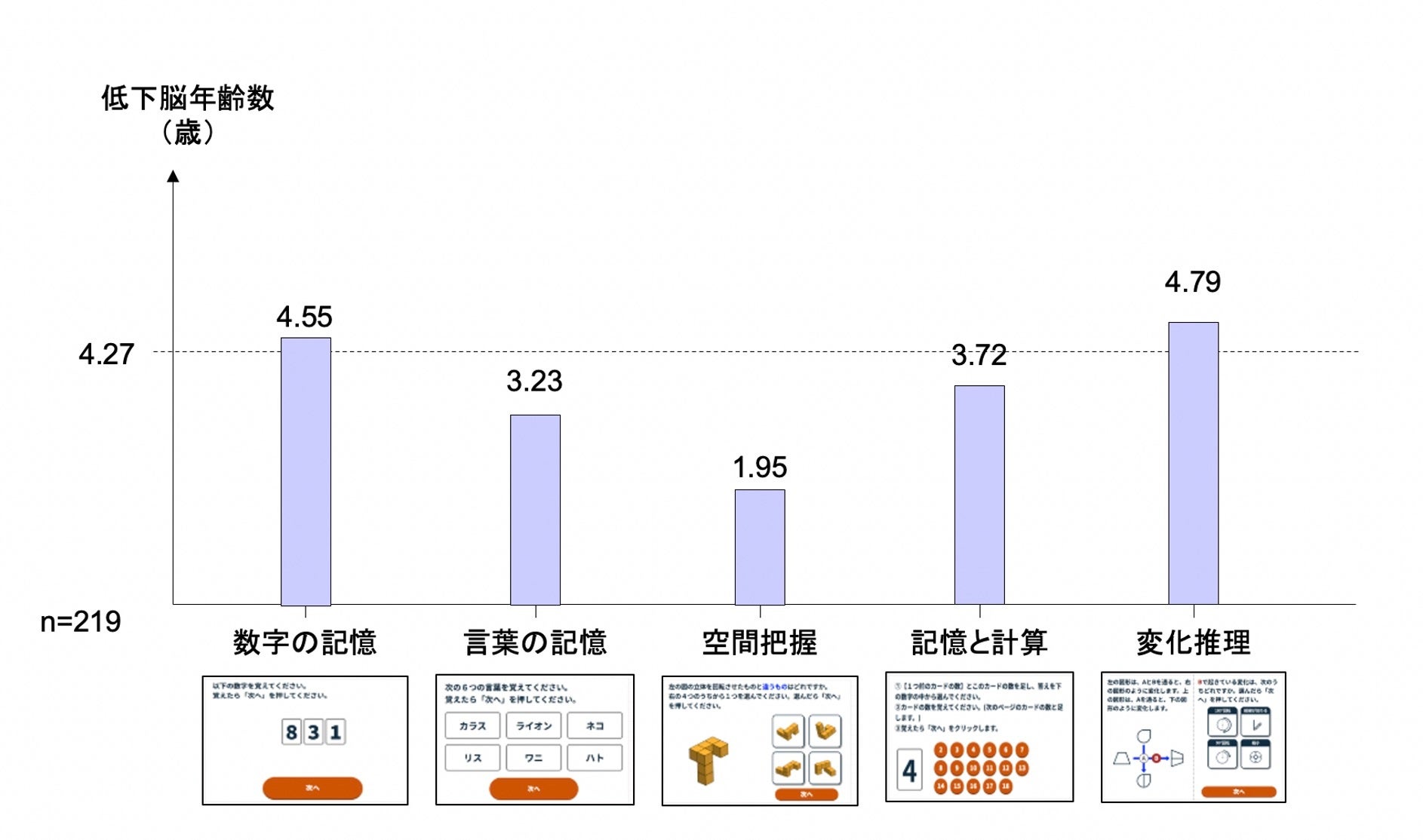 - 「変化推理」「数学の記憶」「言葉の記憶」「記憶と計算」「空間把握」の5つの分野の中で「変化推理」「数字の記憶」、の分野が特に上昇し、「空間把握」においては上昇があまりみられなかった。