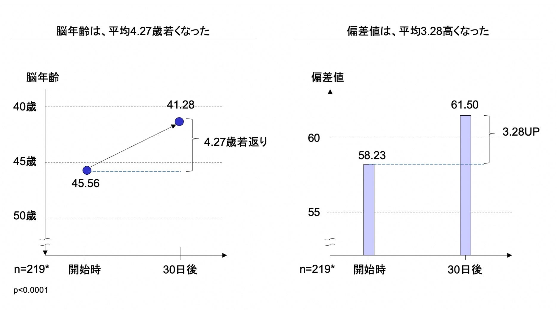 モニター調査の結果、開始時は平均.45.56歳だった脳年齢が30日後には平均41.28歳となり、平均4.27歳脳年齢が若くなり、偏差値は平均3.28高くなるという結果となりました。