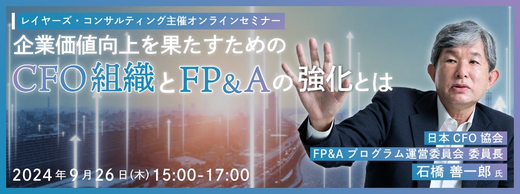 株式会社レイヤーズ・コンサルティング(東京都品川区、代表取締役CEO:杉野 尚志、以下:レイヤーズ)は、オンラインセミナー『企業価値向上を果たすためのCFO組織とFP&Aの強化とは』を2024年9月26日(木)に開催することを発表いたします。