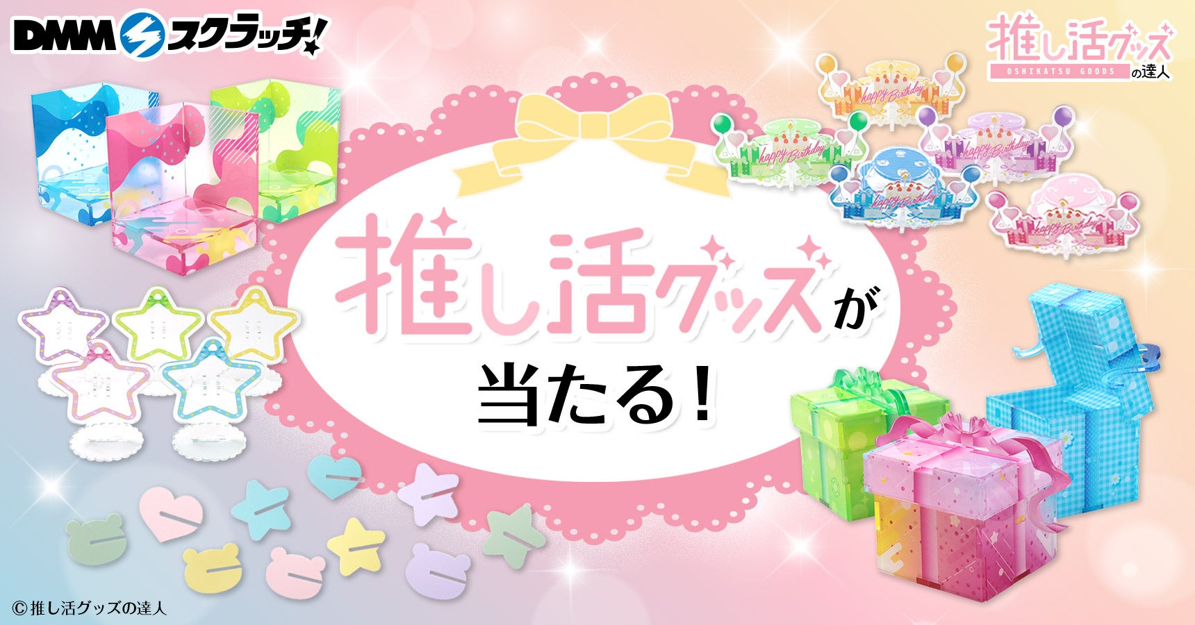 2023年6月16日(金)より、「推し活グッズの達人」では、ハズレなしのオンラインくじサービス「DMMスクラッチ」にて、「推し活グッズが当たる! スクラッチ」(税込660円)を販売。本くじでは、アクスタをかわいく飾れる「推しばこ」や「すみっこステージ」など、未発売の商品をはじめ、推しグッズをかわいくディスプレイできるアイテムを中心にラインナップしています。さらに、パステルカラーとカタチが特徴的な「パステルひな壇」(全5色)が抽選で当たる「Wチャンス賞」を計38日間開催。推しカラーを基調とした、かわいい色展開と推し活を彩るディスプレイグッズが盛りだくさんのスクラッチくじです。