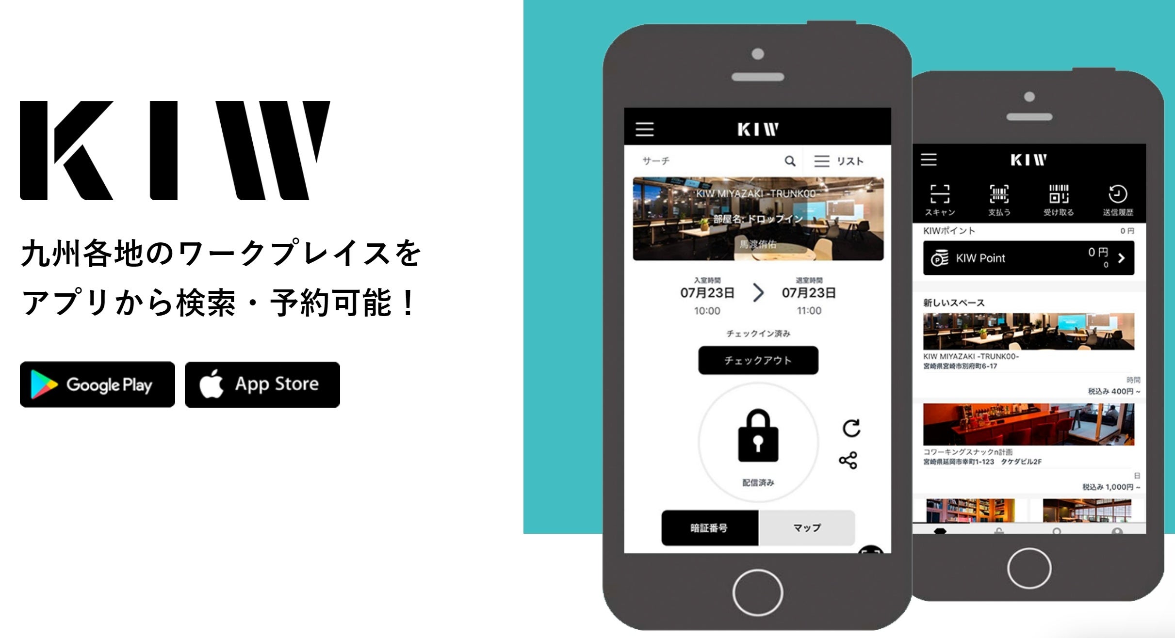 ブースの空き状況の確認や予約は、九州アイランドワーク株式会社が開発した専用アプリ KIW を利用。スマホアプリから簡単に予約や決済、スマートロック(電子キー)の解錠(*2)が可能です。