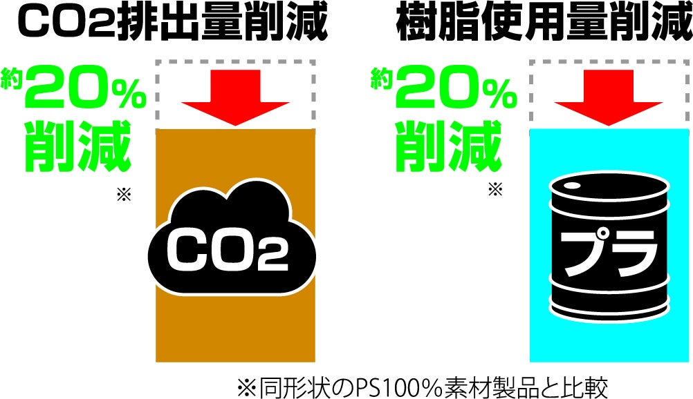 “2030年までにワンウェイプラスチックを累積25%排出抑制”するという同法の目標達成にも貢献いたします。また、同形状のポリスチレン100%で作られた製品と比較した場合、CO2排出量と樹脂使用量を約20%削減可能で、カーボンニュートラル社会の実現に向けてつくる責任を果たしてまいります。