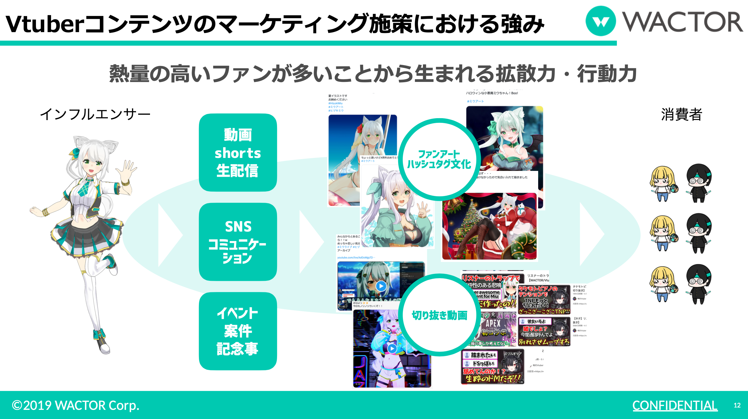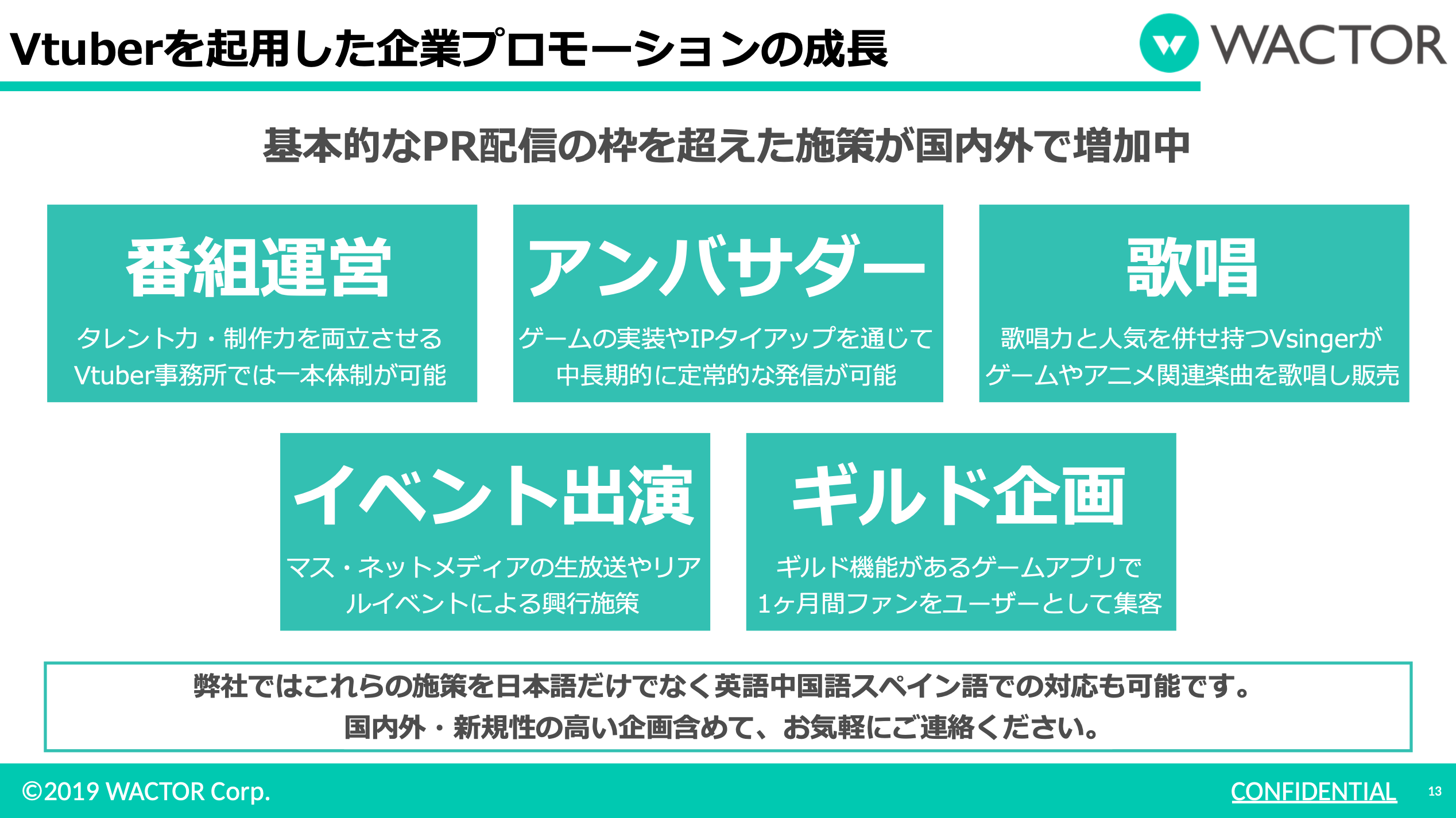 また専属VTuberだけでなく外部インフルエンサーと連携したインフルエンサー代理店事業も行っており、海外ファンに向けた日本企業の外国向けマーケティング支援や外国企業の日本国内向けマーケティング支援などグローバルマーケティングサポート「WACTOR GLOBAL NETWORK」を提供中です。