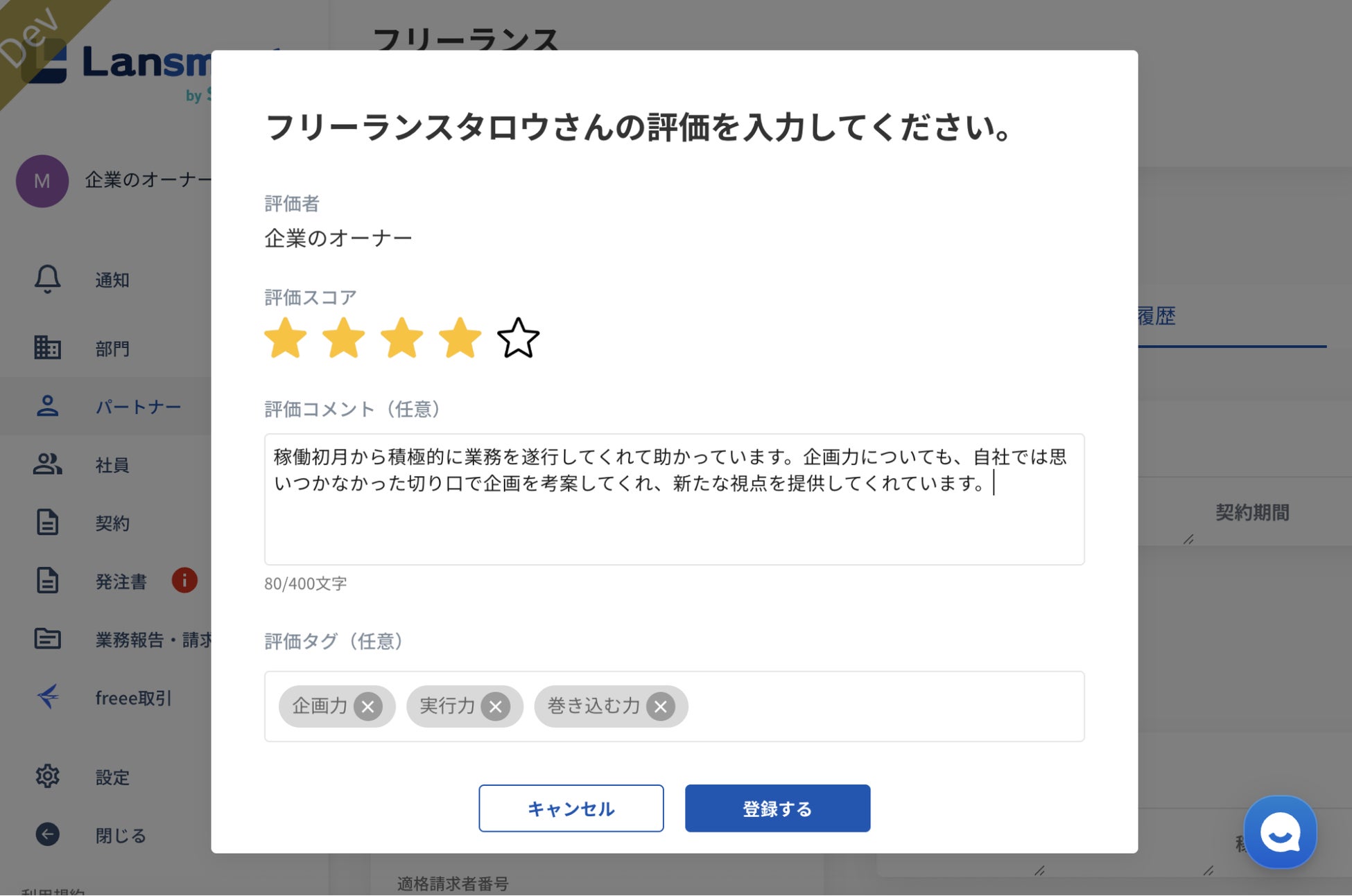 こうした状況を受けて、「Lansmart by SmartHR」では、企業が業務委託者に対する定量・定性の評価データを蓄積し、社内で共有できる「パートナー評価機能」を提供いたします。本機能を通じて、業務委託者一人ひとりが力を発揮できる環境づくりを支援します。