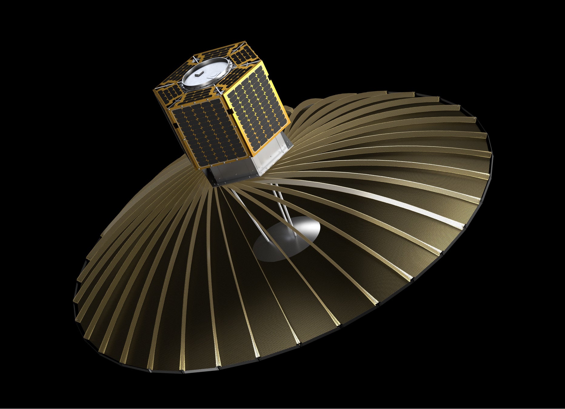 打上げ時は収納可能な開口直径3.6mのパラボラアンテナ