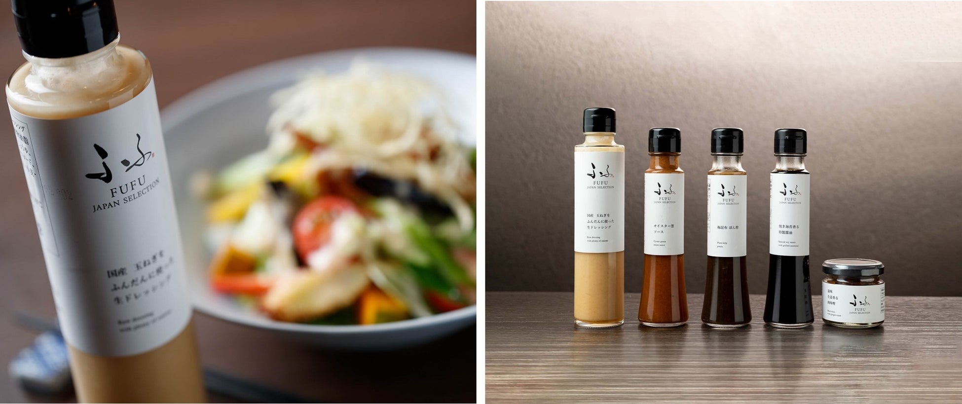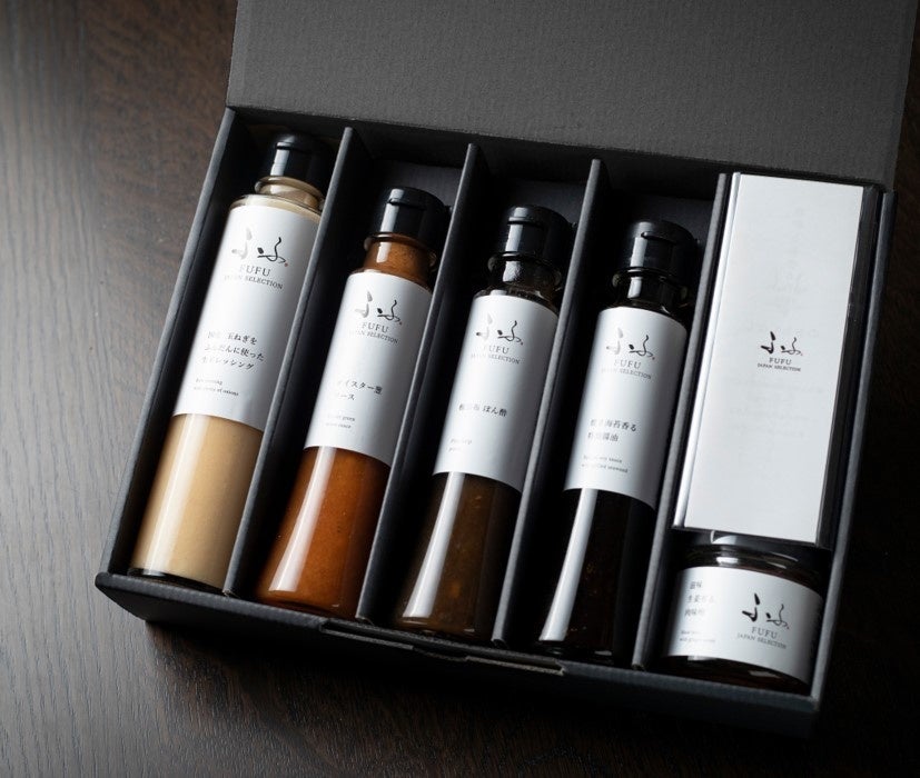 (右) ふふ実店舗で販売中のドレッシングやソースなど5種類