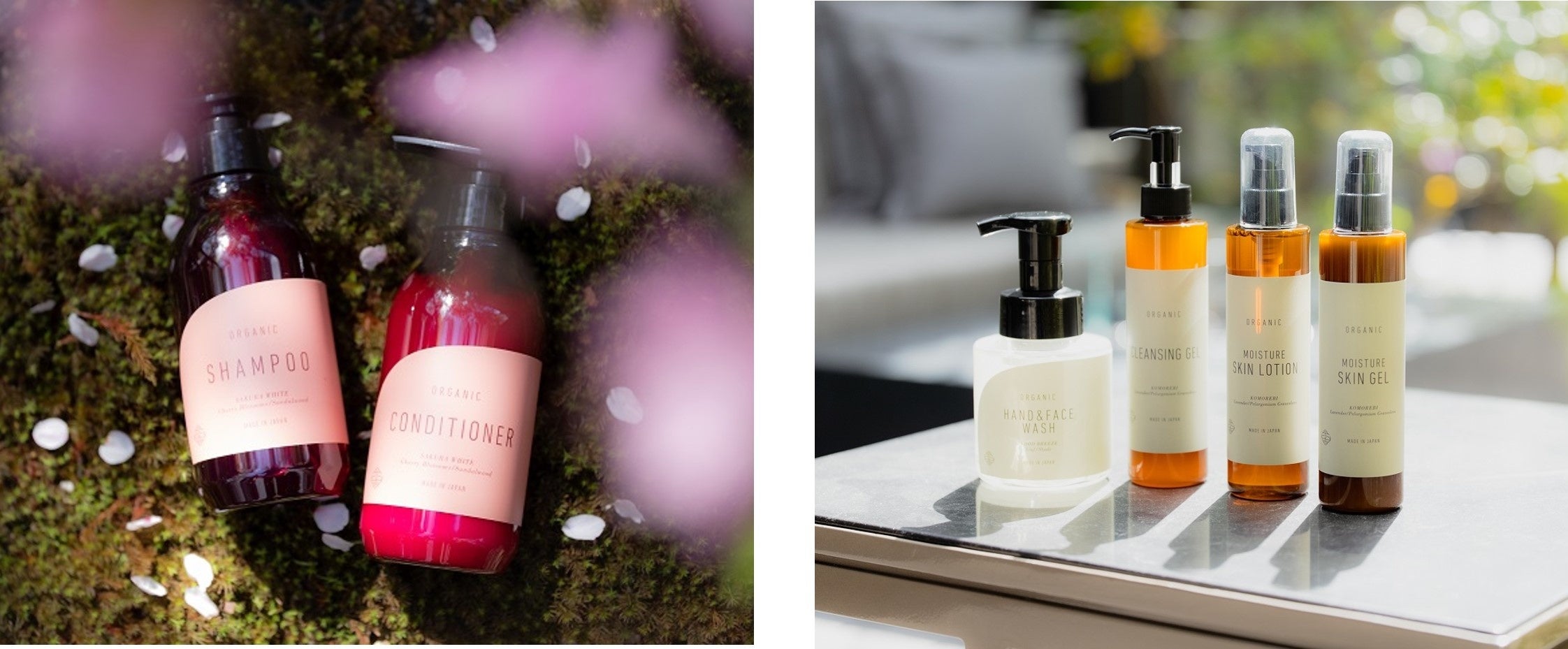 (左) 全6種類のアメニティはすべてオーガニック製品。写真は「ふふ 京都」で展開する桜と白檀の香りのシャンプーとコンディショナー。