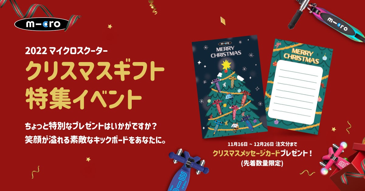 クリスマスシーズンを迎えシーンに合わせたオススメなキックボードをご紹介、期間内に対象商品を購入するとハンドルグリップ(ホンカータイプ)を数量限定でプレゼントいたします。また、購入者全員にはオリジナルクリスマスカードもプレゼントします。
