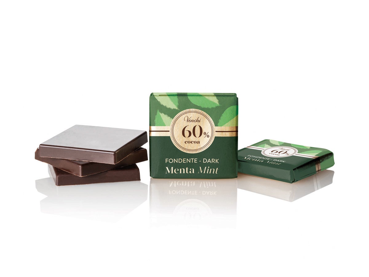 ミント風味グレイン入りのダークチョコレート。濃厚な60%のダークチョコレートの中に爽やかなミント風味のグレインをとじ込めた、ミニサイズのチョコレートバー。