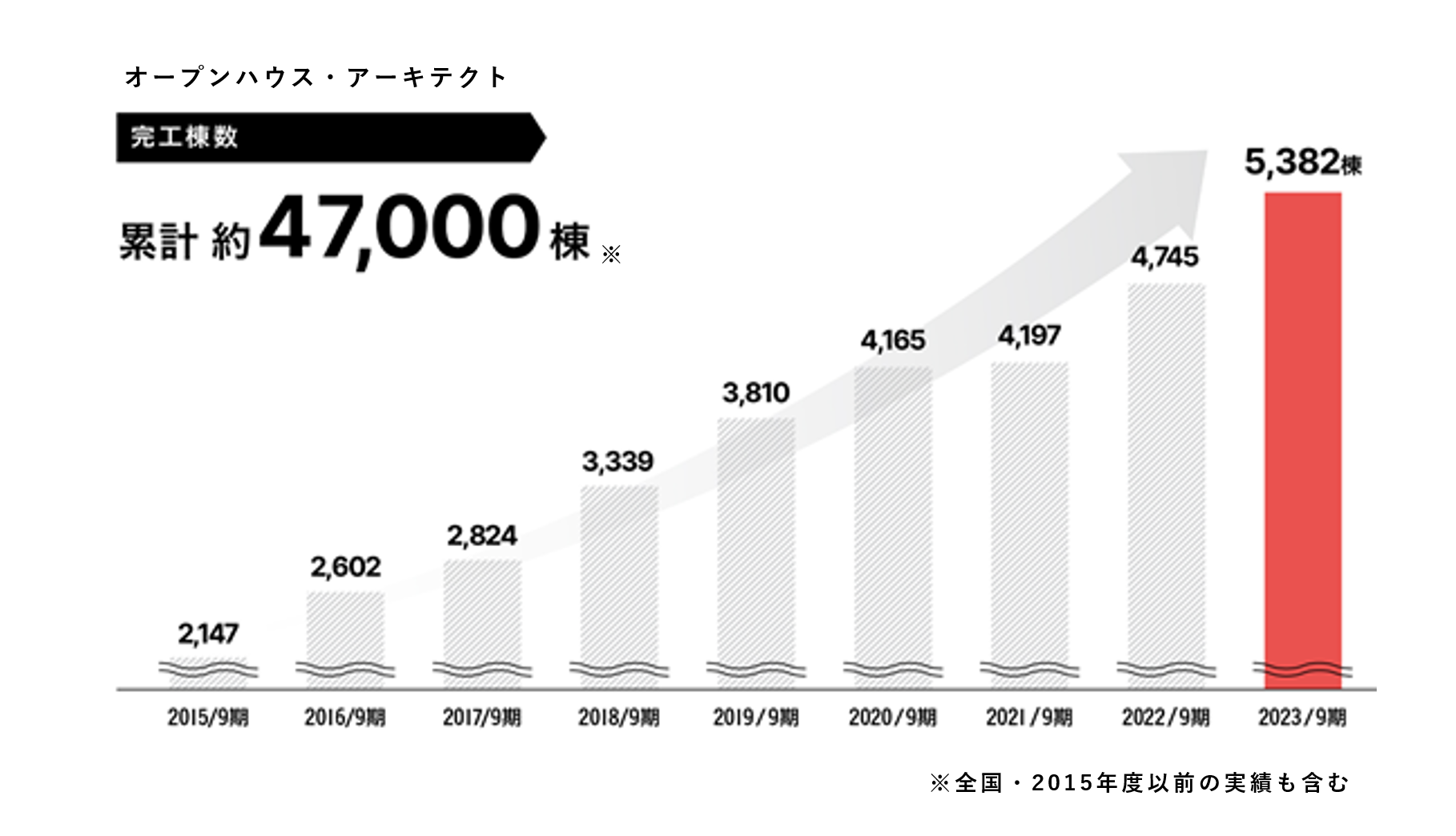 オープンハウス・アーキテクトは、毎年建築棟数を伸長しております。今後さらなる棟数拡大を計画しており、安定・継続した収入をご期待いただけます。