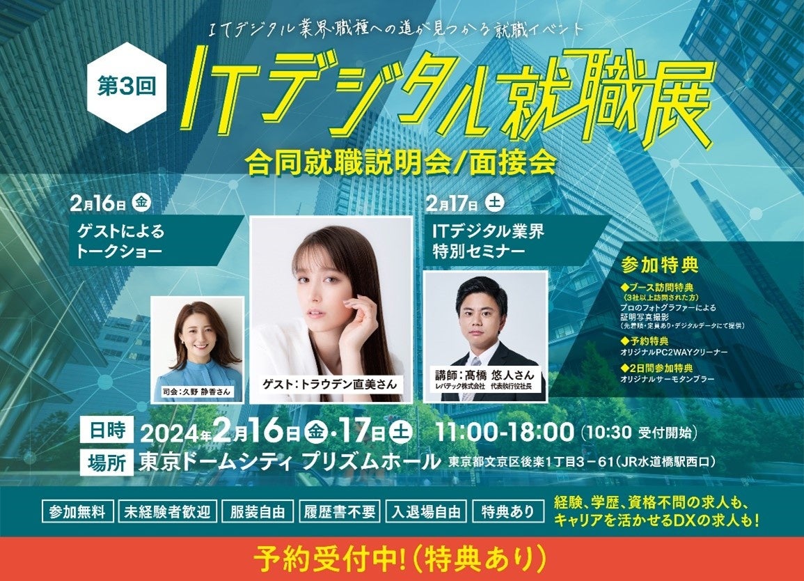 高千穂交易株式会社(本社:東京都新宿区、代表取締役社長:井出尊信、証券コード :2676)は、2024年2月16日(金)に、東京都主催の合同就職説明会「ITデジタル就職展」に出展します。