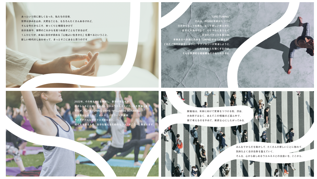 LIFE TUNING DAYSは、ヨガをはじめとして、ワークアウトやオーガニックフード、 美容、ライフスタイルなど、現代を⽣きる⼈の「⼼とカラダを整えるためのヒント」を提供してまいりました。本イベントでは、コロナ禍で一変した新しい日常の中、1人ひとりが本当に自分が求める「心地よい生き方」を見つけるための、さまざまなウエルネスに触れられる場所をめざします。