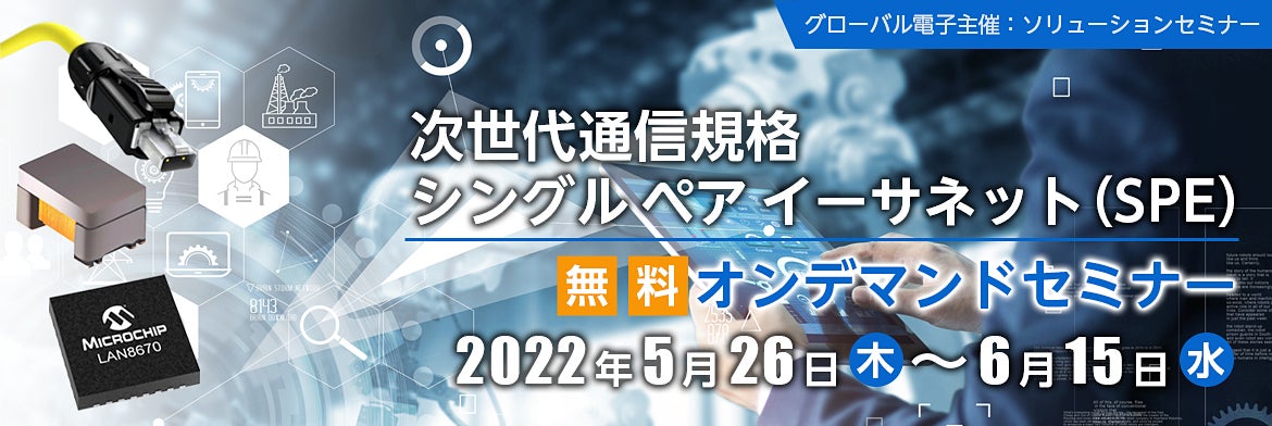 グローバル電子株式会社(東京都新宿区 代表取締役:松田 樹一)は、「次世代通信規格シングルペアイーサネット(SPE)無料オンデマンドセミナー」を公開いたします。当セミナーは、グローバル電子の取扱いメーカである TE Connectivity、Bourns、MicrochipTechnologyの3社から講師をお招きし、各社対応製品と規格の最新情報についてオンデマンド形式でご紹介いたします。公開期間は2022月5月26日(木)~6月15日(水)の3週間で、業務の合間などご都合にあわせて視聴しやすくなっております。この機会にSPE導入の検討等に是非お役立てください。