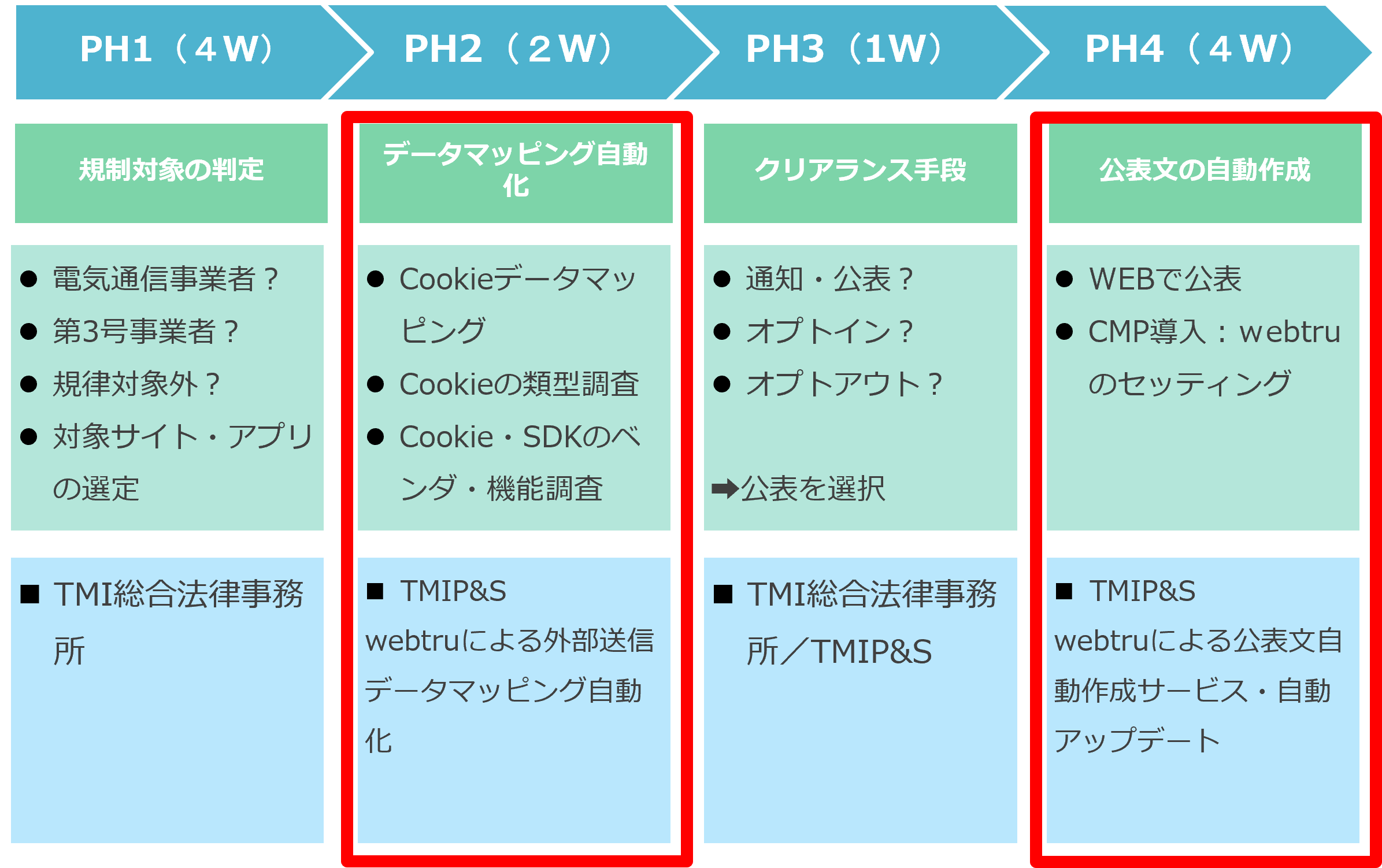 - 企業が改正電気通信事業法の規制対象事業者となるかの入り口の課題(フェーズ1)から、実装支援(フェーズ4)までシームレスに実現