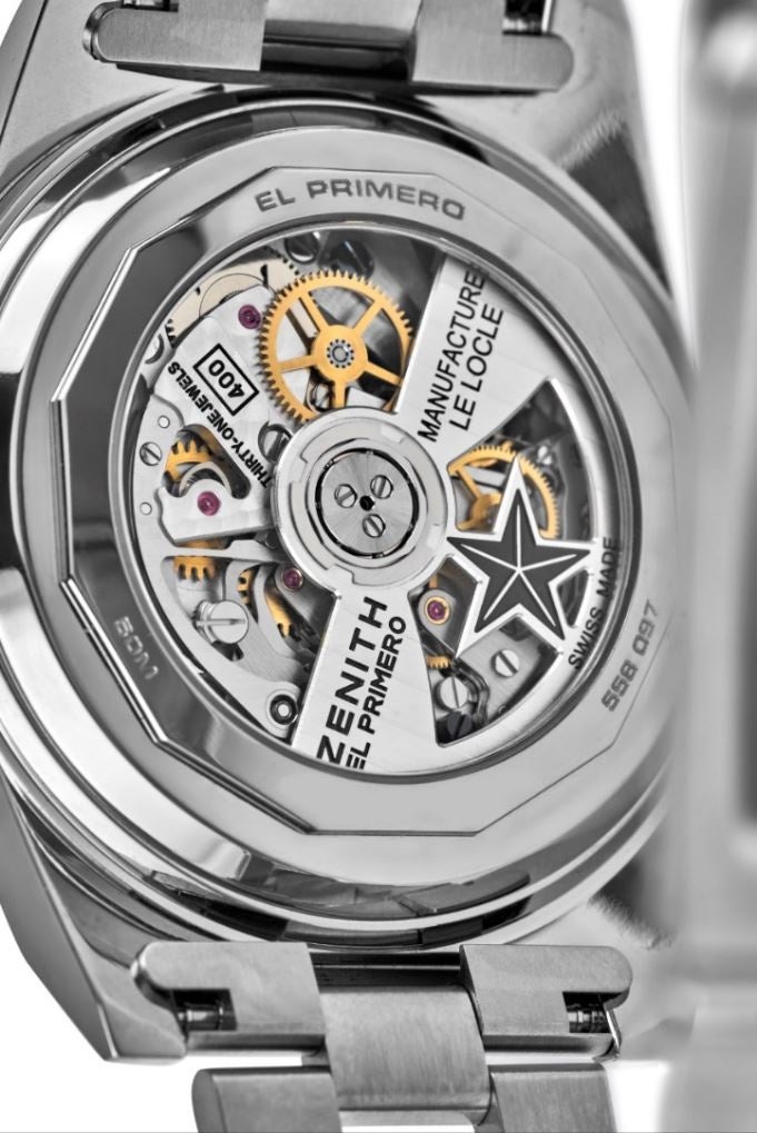 サファイアガラスの裏蓋からは、1969年に発表されたオリジナルの高振動エル・プリメロ自動巻クロノグラフ・ムーブメントを忠実に継承したキャリバー エル・プリメロ 400の5Hz(毎時360’000振動)の振動を見ることができます。