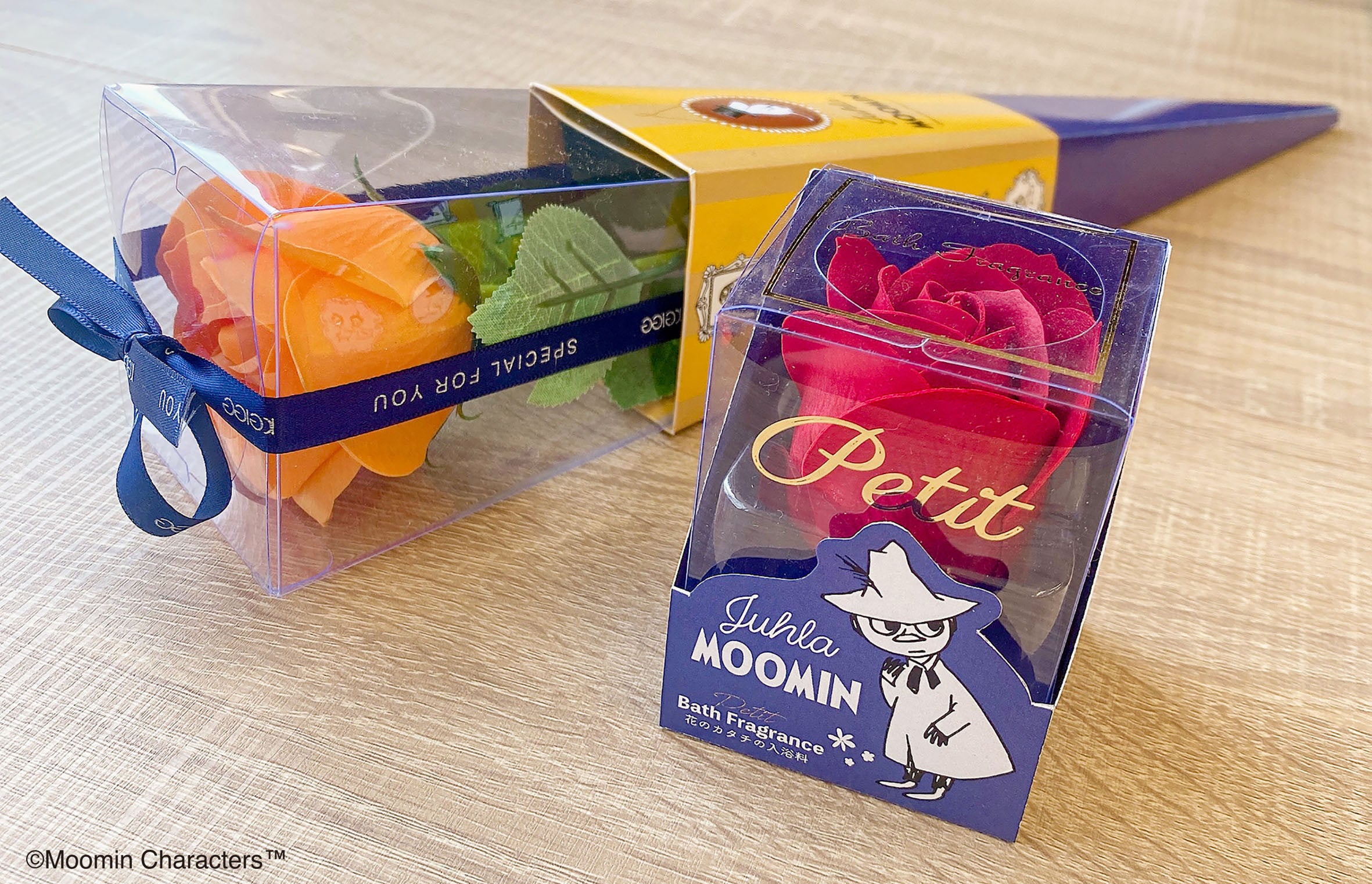 ユフラのアートのパッケージに包まれた花の形の入浴剤はカジュアルなギフトにも。