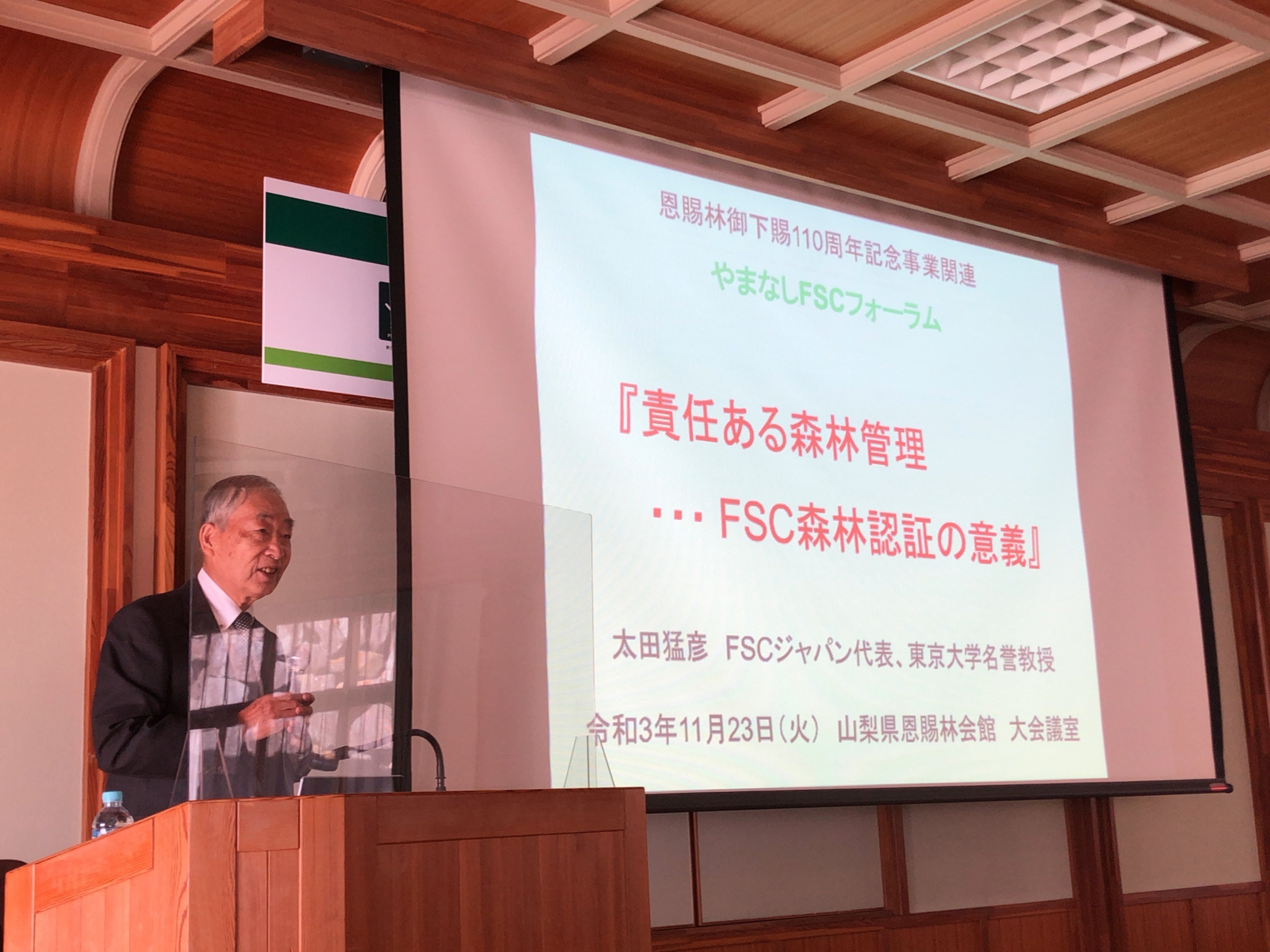 恩賜林御下賜から110周年の関連事業として開催された同フォーラムでは、FSCジャパン代表の太田が基調講演を行い、パネルディスカッションでは、FSC認証を推奨する企業の代表者などと意見交換を実施