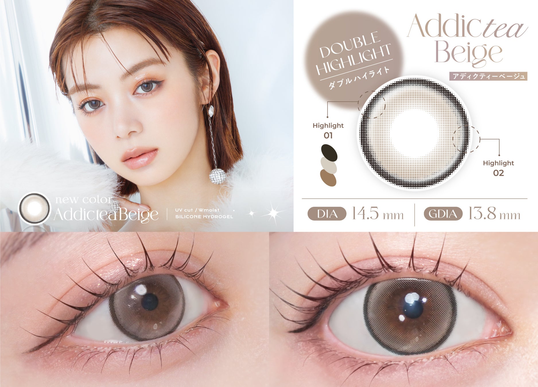 光沢ツヤ瞳仕上げ。つやんと光沢感のあるミルクティーベージュで、目の中で回っても気にならないダブルハイライトデザイン。