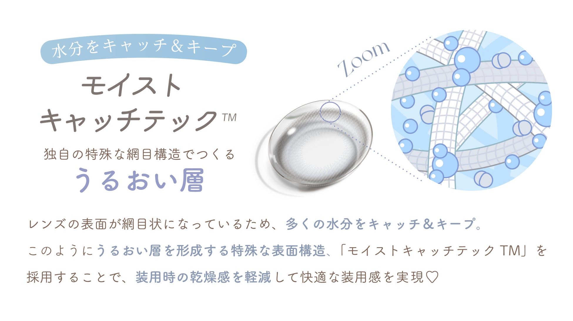 キャッチした水分を留まらせ、レンズ表面に潤いをキープすることが可能になりました