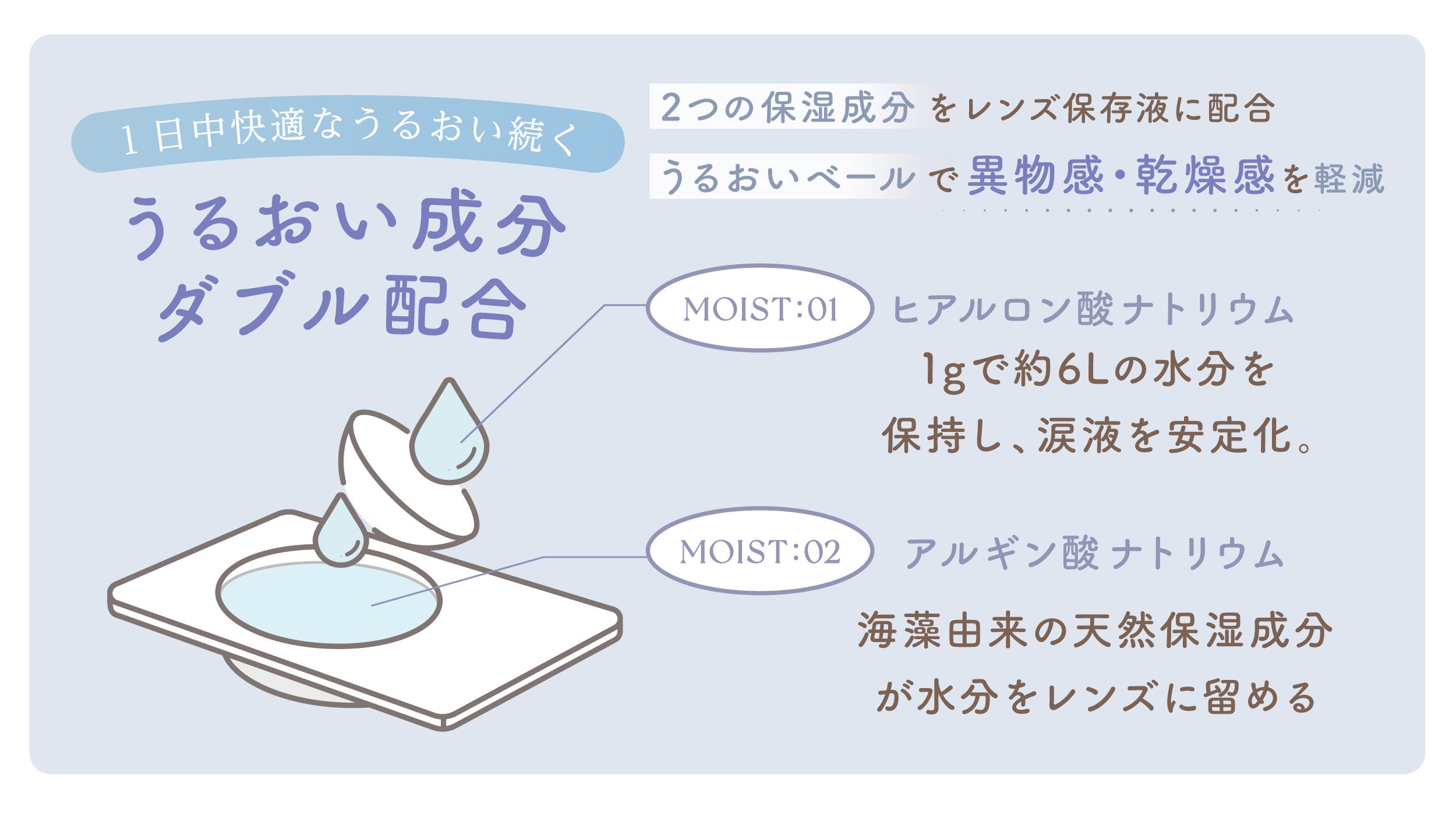 涙液を安定化させるヒアルロン酸ナトリウム、水分を蓄えてレンズ内に留まらせる働きをするアルギン酸ナトリウムの二つの保湿成分を含んだレンズ表面が瞳をやさしく包み、自然で快適なつけ心地を実現します。