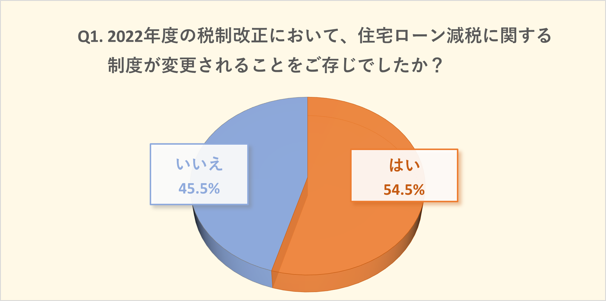 1) 住宅ローン減税に関する税制改正の認知度は54.5%。多数派ではあるものの、およそ半数に留まる結果に。
