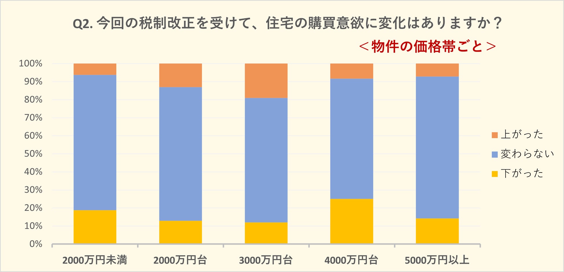 3) 税制改正を受けて住宅を購入する意欲が「下がった」は15.7%で、「上がった」の12.1%を上回った。「物件の価格帯ごと」に分けると、3000万円台の物件のみ約2割の方が「上がった」と回答し、「下がった」の項目を上回った。