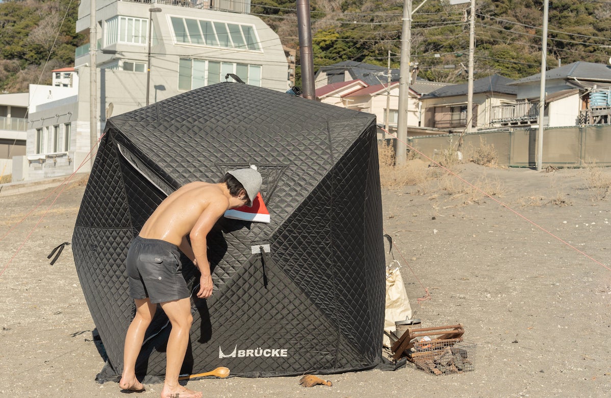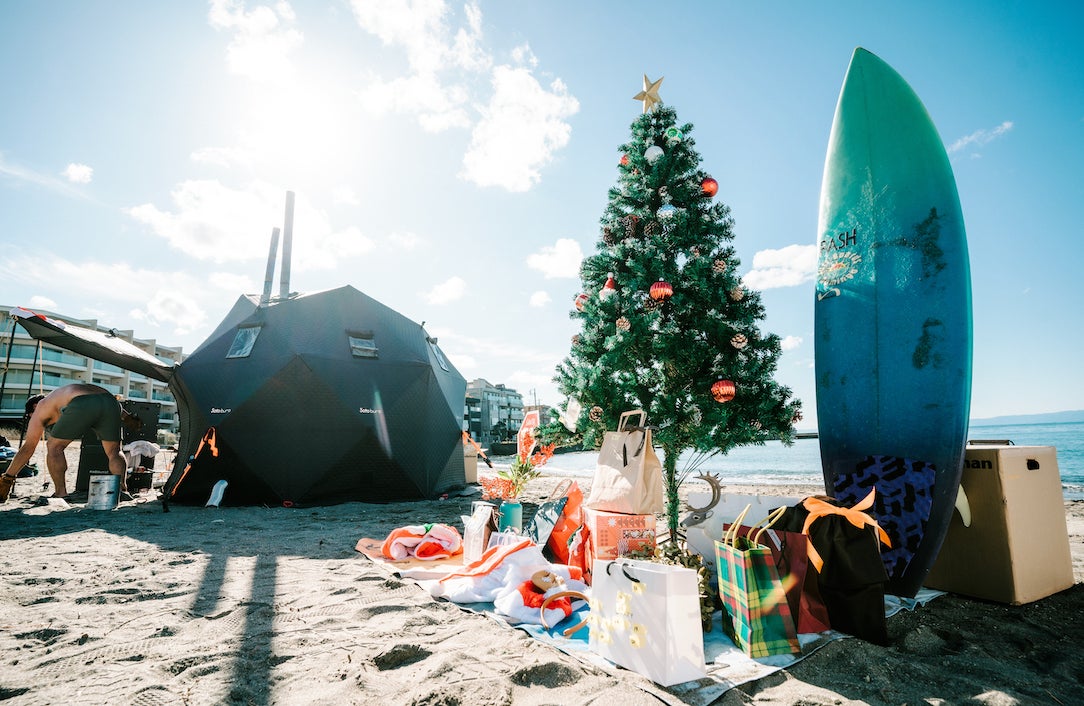 冬の葉山ビーチに到着した参加者を待っていたのは、大きなクリスマスツリーとサウナテントが並ぶ驚きの光景でした。冬のビーチでサウナという意外性は、参加者の期待を良い意味で裏切り、記憶に残るクリスマス体験を提供しました。