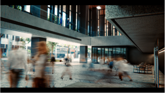 ②街とビルにあえて境を作らないことで、街と人がつながり生き生きとした街が生まれる様子。