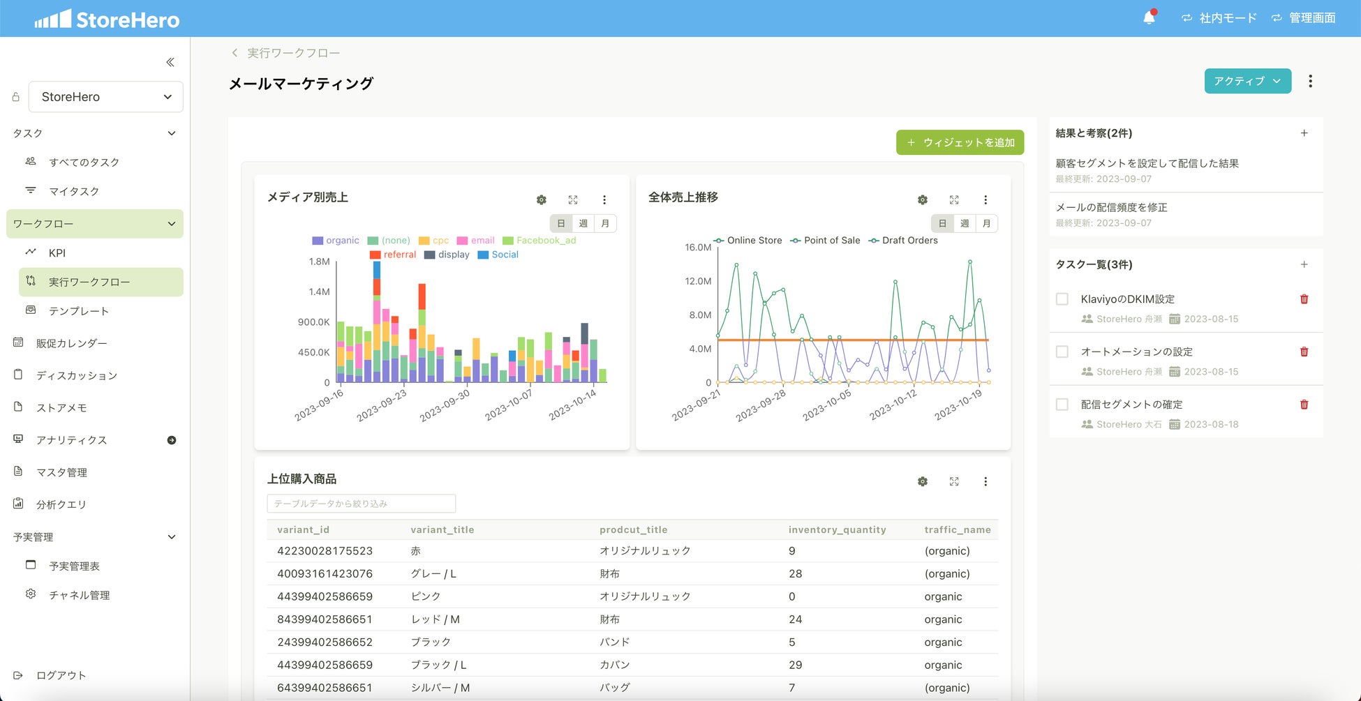 Shopify、Google Analytics、各種広告媒体など、さまざまなツールと連携することで、売上向上に必要な各施策の実行や検証に必要なデータが、プラットフォーム上でグラフや表で一元管理できます。
