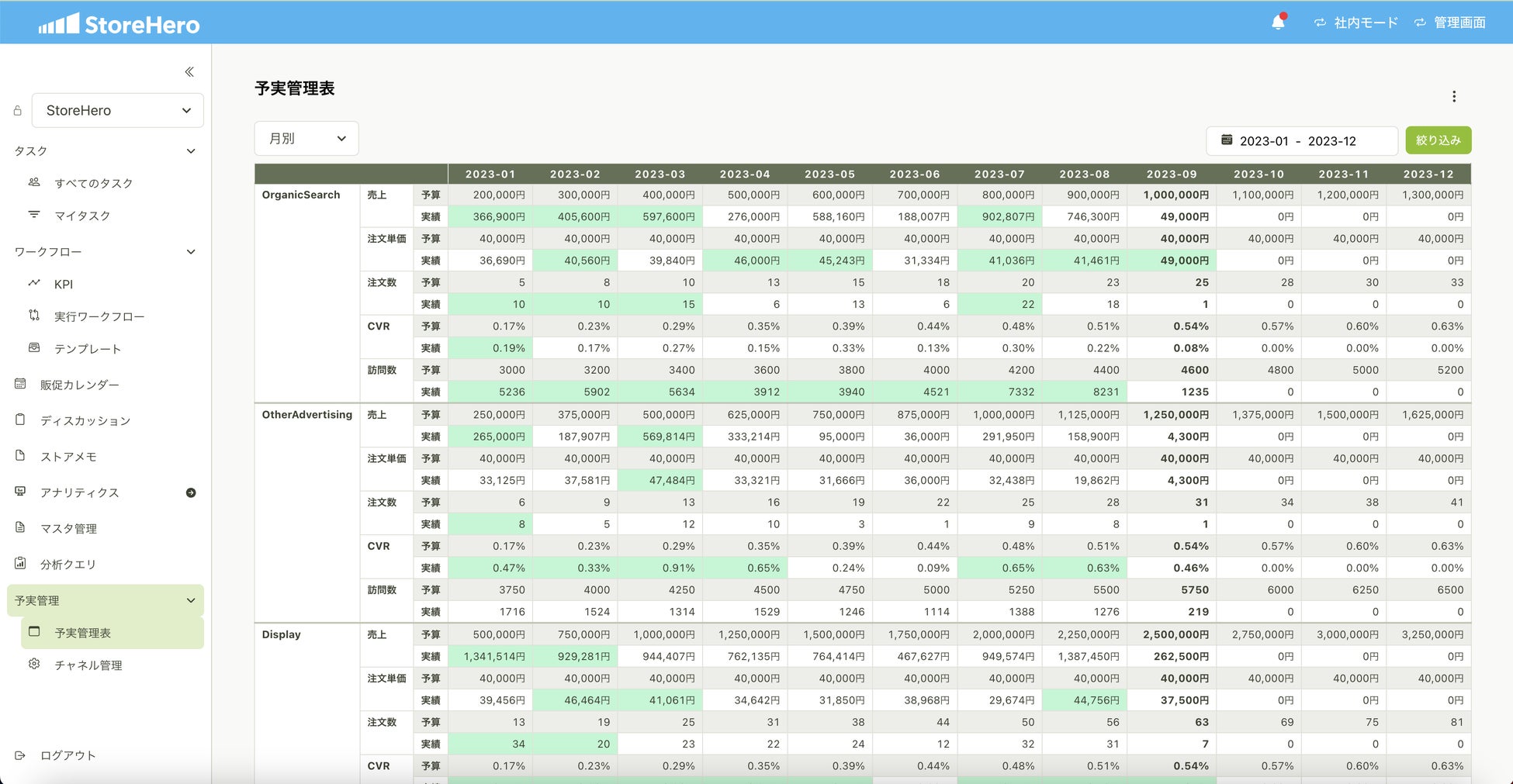 自動集計されたチャネル毎の実績と、あらかじめ決めた目標値を一覧で比較することができます。