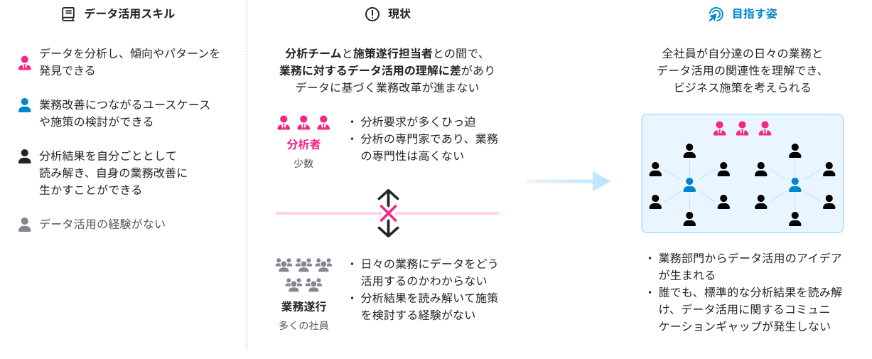 このように、「データを分析するスキルを持った人材」だけではなく、「テーマの企画力を持った人材」や「業務活用能力を持った人材」を育成し、企業におけるデータ利活用の文化や、業務部門におけるビジネスアナリティクスの定着を実現します。