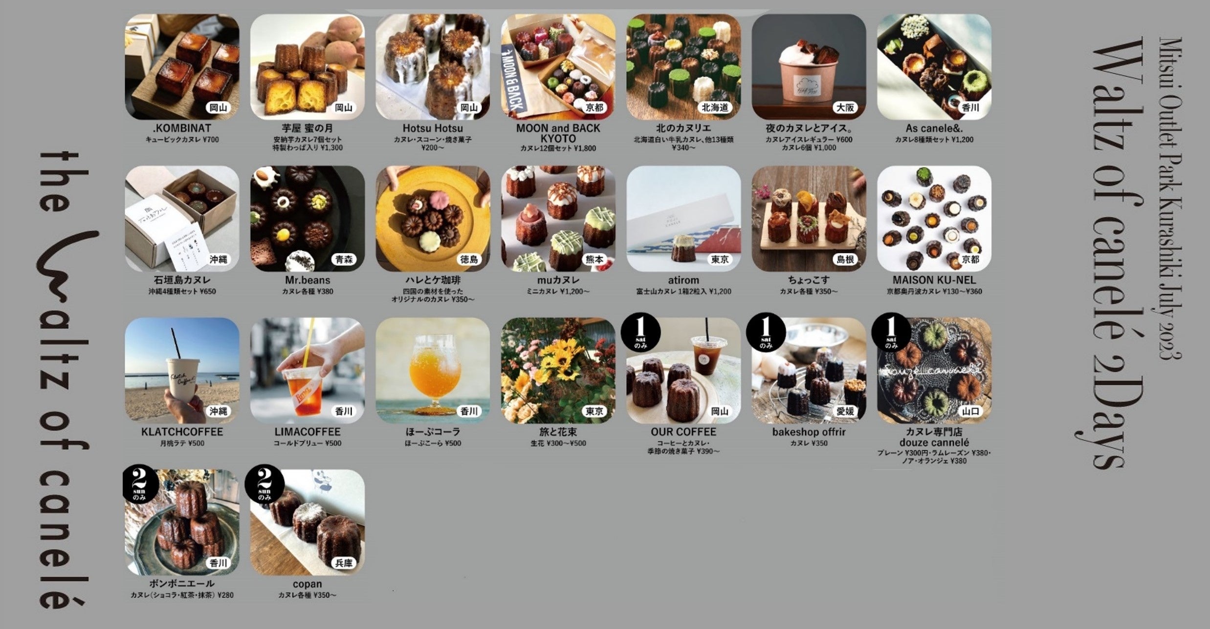 カヌレのワルツでのお買上げで貰える引換券と、三井アウトレットパーク 倉敷館内のお買上げレシート1円以上のご提示で、三井アウトレットパーク 倉敷館内でご利用できるグルメカフェチケット(200円分)をプレゼントいたします。