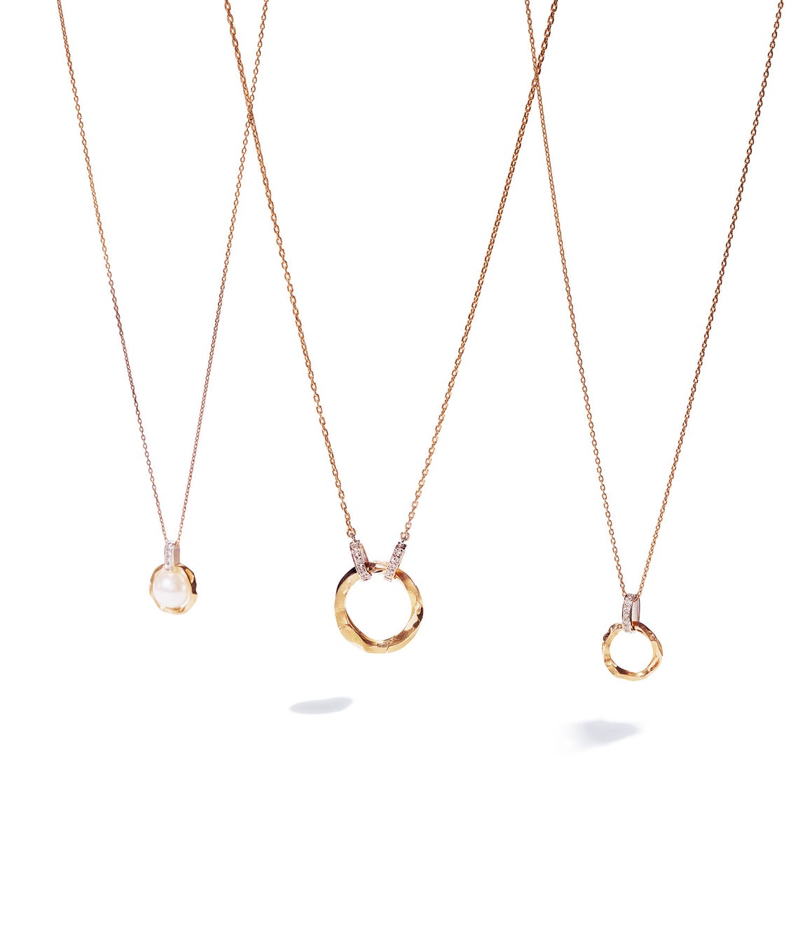 Enペンダントは、金継ぎのディテールが見事なサークルデザインが特徴です。 サークルはダイヤモンドの付いたチェーンに接続されており、単独で着用したり、他のアイテムと重ねたりするのに十分な汎用性を備えています。