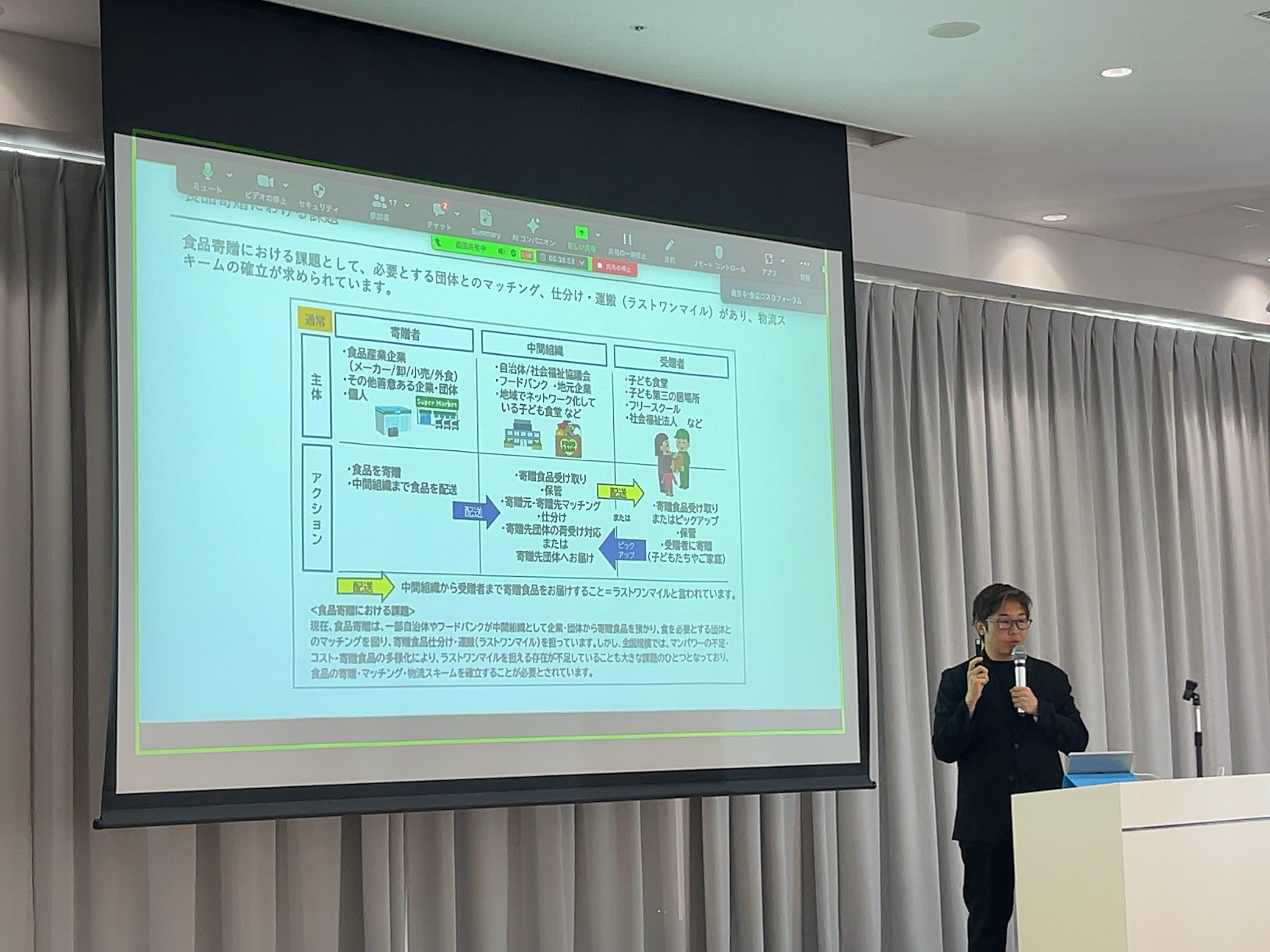 そのゲストスピーカーとして、こどもスマイリング・プロジェクトが取り組む食品寄贈『ハートドライブキャンペーン』の東大阪市で実施した地域の企業・障がい者支援団体・こども支援団体・自治体が連携し、余剰食品を食を必要とする子どもたちに寄贈した地域共生モデルを、大阪・関西万博に向けての参考取組として実例紹介しました。
