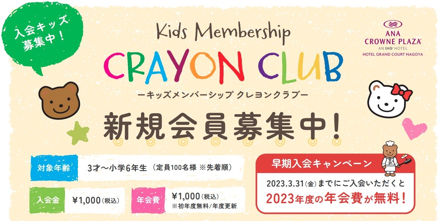 ANAクラウンプラザホテルグランコート名古屋(名古屋市中区、執行役員総支配人:島原 東)は、キッズメンバーシップCRAYON CLUB(クレヨンクラブ)を新設し、2023年度の新規会員を募集します。同クレヨンクラブに入会頂くと、2Fガーデンコートのブッフェがいつでも無料の他、バースデーケーキプレゼント、お子様向けイベント優待割引&優先予約の他に、レストランご利用時同伴の方20%OFFなどの魅力いっぱいの特典付きです。