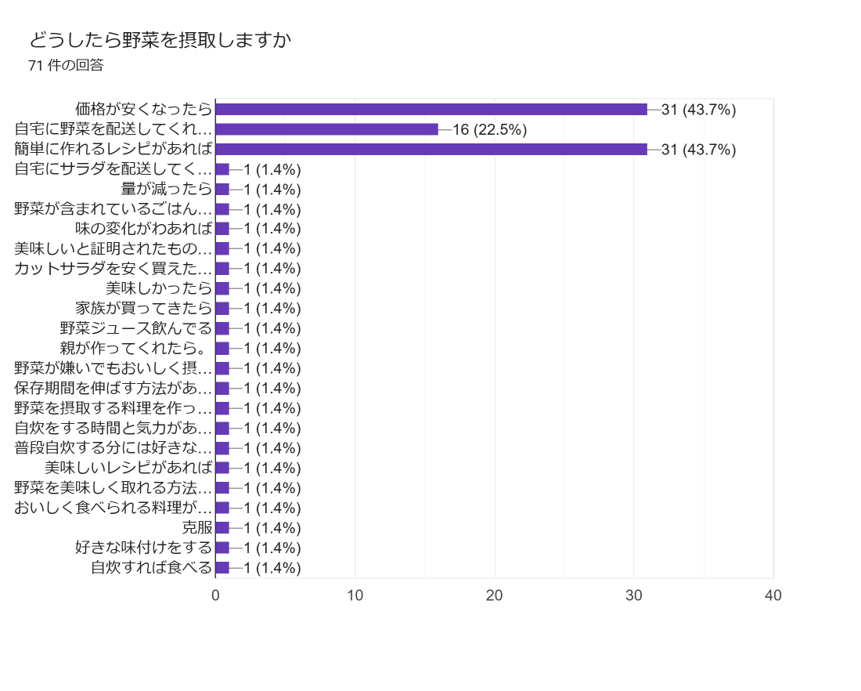 東洋大学「Teamベジタクル」が「どうしたら野菜を摂取するか」と学生にアンケートをとったところ、「安くなったら」「簡単に作れるレシピがあれば」という回答が最も多く、約4割以上の生徒が回答しています。