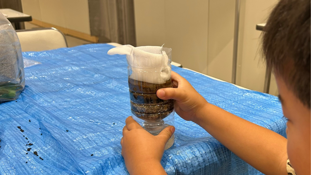 ペットボトルにカット綿・小石・砂利・炭・砂・ガーゼといった身近な素材を詰め、泥水をろ過する体験を実施しました。繰り返し挑戦しながら水が澄んでいく様子に子どもたちは夢中に。災害時に「きれいな水」がどれほど貴重かを実感するとともに、実際には煮沸などの追加処理が欠かせないことも学びました。