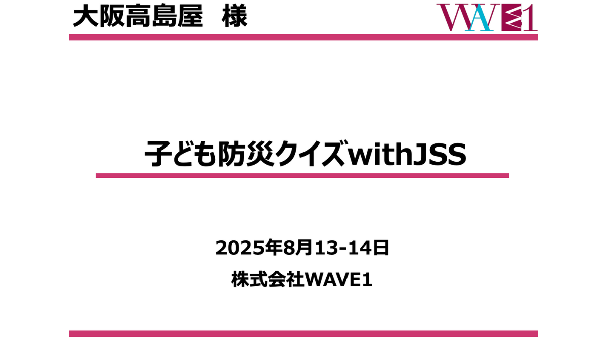 株式会社WAVE1(本社:東京都杉並区、代表取締役:吉村 拓也)は、2025年8月13日(水)・14日(木)の2日間、大阪髙島屋にて、親子向け防災教育ワークショップを実施しました。 本企画には延べ51名の親子が参加。火災・地震・風水害・テロといった多様なリスクをテーマに、遊びや実験を通じて「日常の延長にある防災」を体感しました。