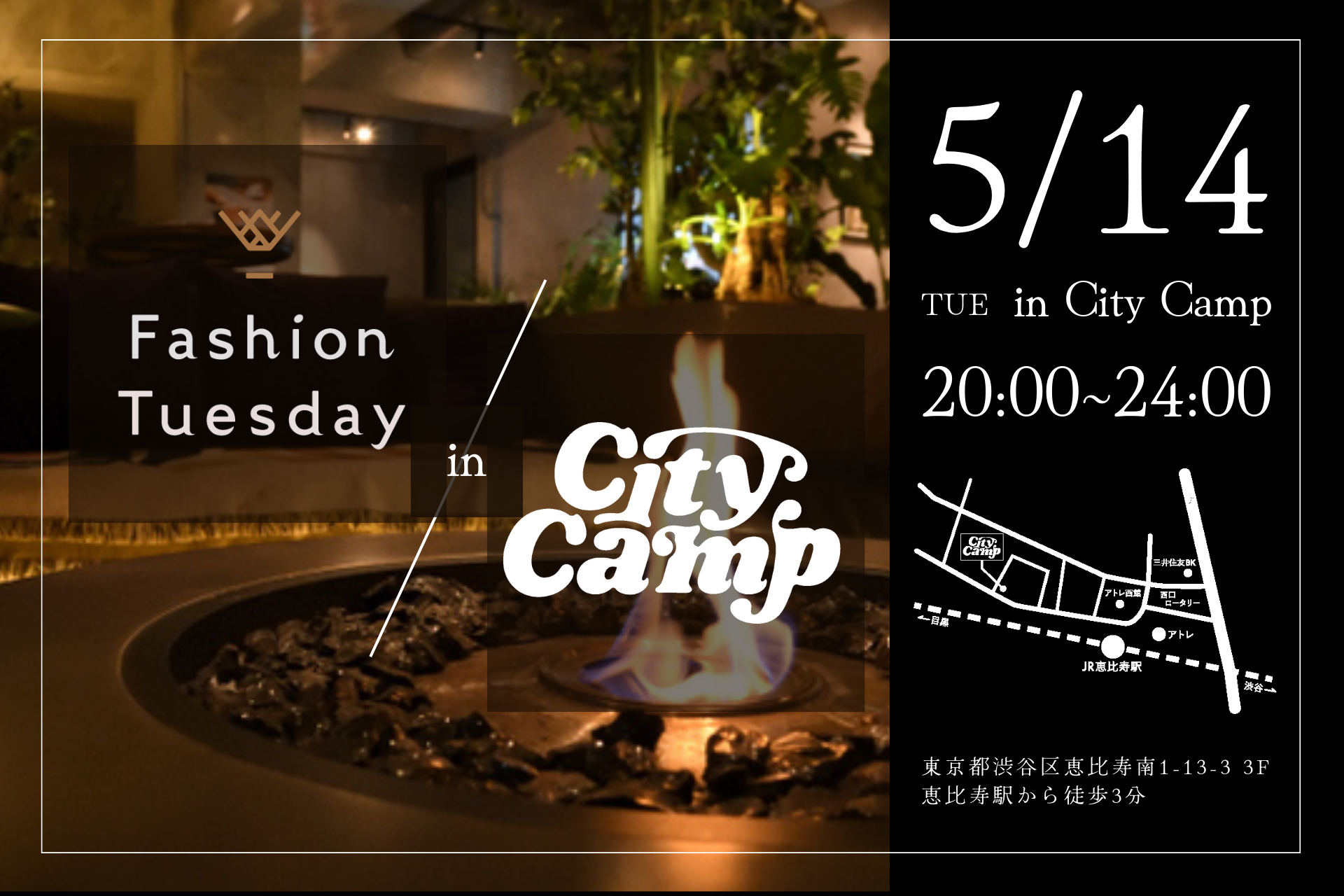 株式会社フォーピープル(本社:東京都渋谷区、代表取締役:田中弘武)が運営しております【Fashion Tuesday –アパ レル関係者限定のBAR-】は『なんでもできる街で、何もしないをしませんか』をコンセプトに、都心にいながら 気軽にキャンプ気分が楽しめる都市とキャンプのカルチャーを融合させた恵比寿の焚き火バー【CityCamp】と 毎年恒例のコラボイベントを今年も下記の通り、開催させていただきます。