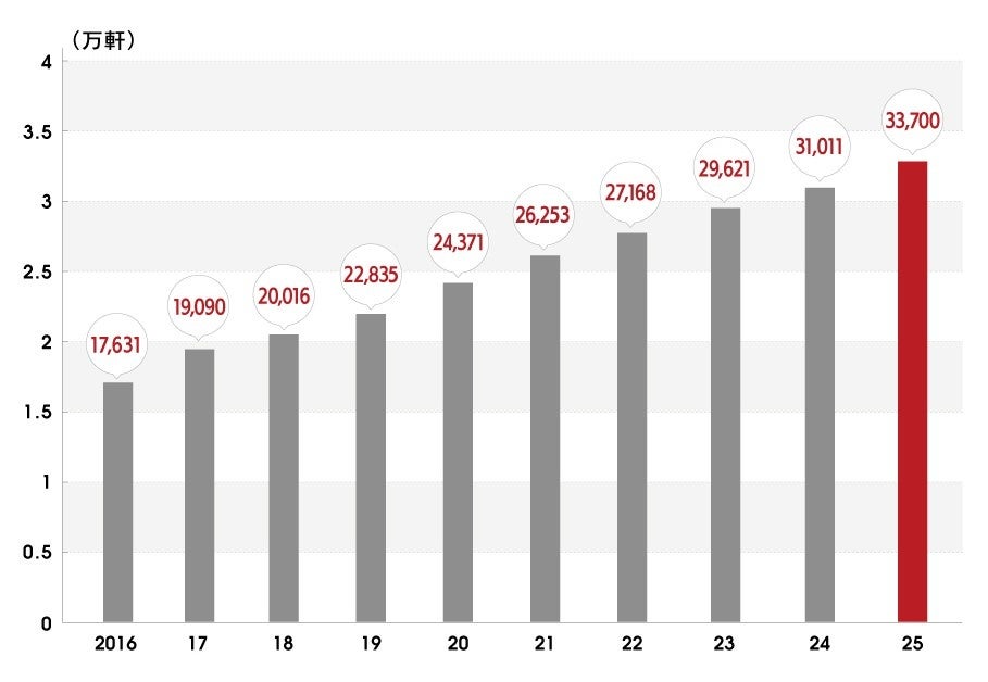 一都三県の飲食店を主な顧客とする当社。2025年3月末の当社顧客数は33,700軒と過去最多軒数となりました。過去10年で見ても毎年多くのお客様にご愛顧いただいたことが、グループ拡大の要因となりました。
